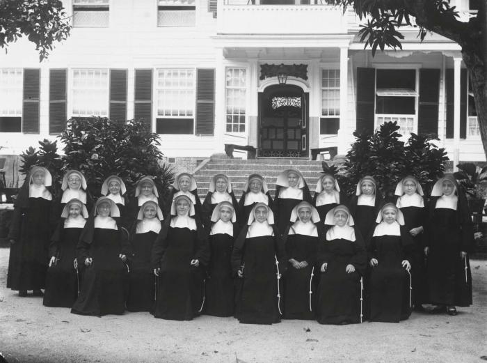 De eerste Zusters van Roosendaal op het terrein achter het klooster aan de HenckArronstraat, waar thans o.a. de Kanselarij van het Bisdom is gevestigd.