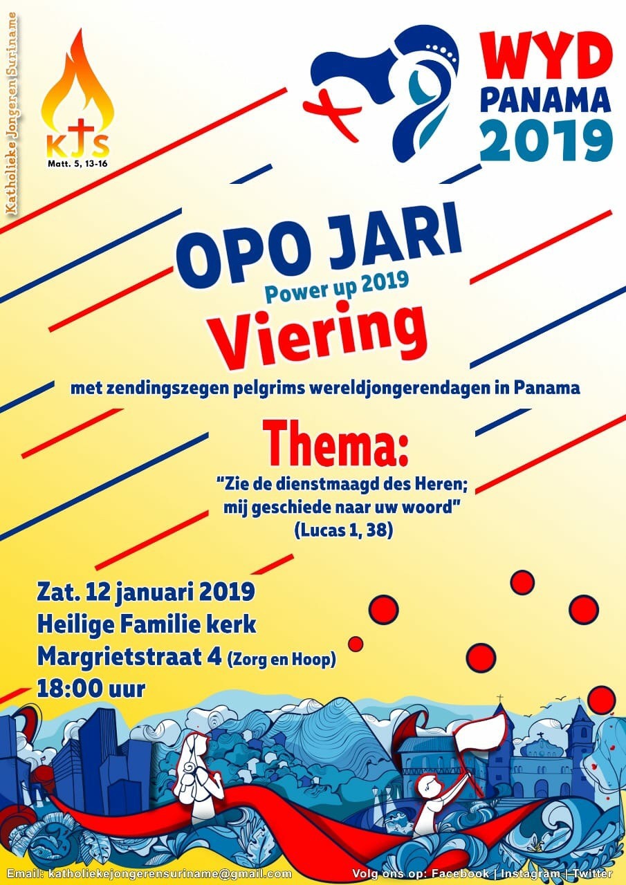 Tijdens de opoyaridienst van de Katholieke Jongeren Suriname (KJS) op 12 januari zal de dienst speciaal opgedragen worden voor het welslagen van onze deelname aan de WJD in Panama en een diepe persoonlijke ontmoeting met Christus voor de pelgrims op voorspraak van Moeder Maria. Aan het eind van de dienst zullen de jonge pelgrims een speciale zendingszegen ontvangen. De groep vertrekt op 14 januari en reist via Aruba naar Panama. De pelgrims zullen 30 januari terugkeren naar Suriname. Eenieder maar vooral jongeren zijn uitgenodigd om de opoyaridienst van KJS bij te wonen in de Heilige Familiekerk om 18:00 uur om zo de jongeren te ondersteunen en het nieuwe jaar op te dragen aan God.