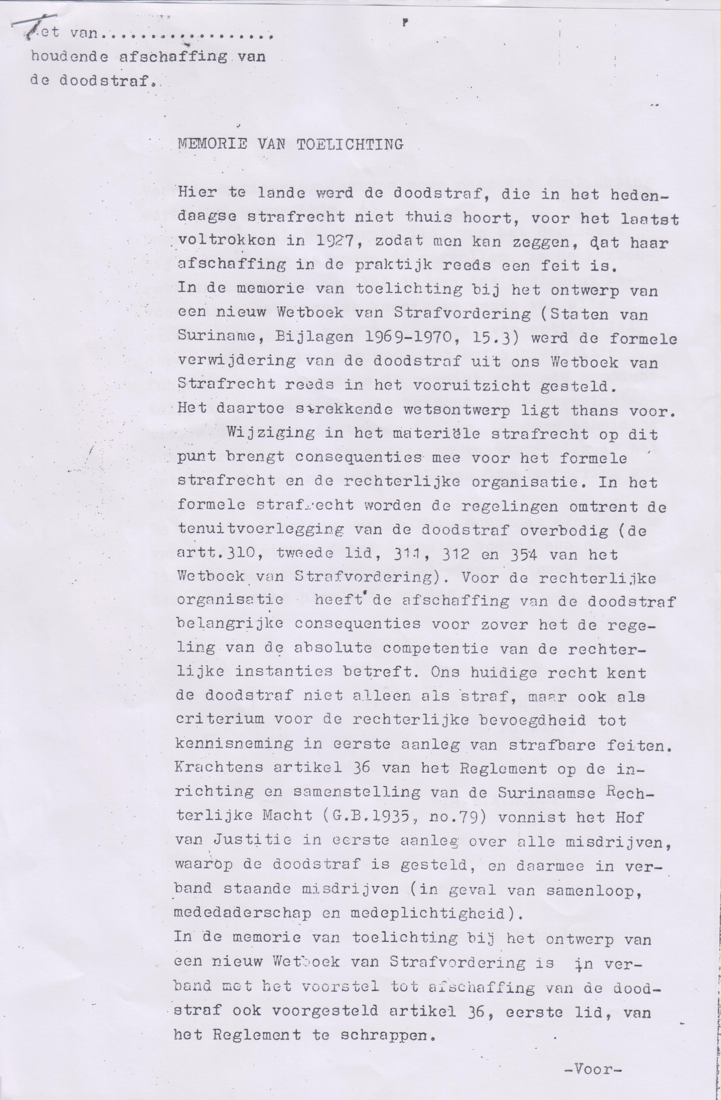 ‘Hier te lande werd de doodstraf, die in het hedendaagse strafrecht niet thuis hoort, voor het laatst voltrokken in 1927, zodat men kan zeggen, dat haar afschaffing in de praktijk reeds een feit is. In de memorie van toelichting bij het ontwerp van een nieuw Wetboek van Strafvordering (Staten van Suriname, Bijlagen 1969 – 1970, 15.3) werd de formele verwijdering van de doodstraf uit ons Wetboek van strafrecht reeds in het vooruitzicht gesteld. Het daartoe strekkende wetsontwerp ligt thans voor.