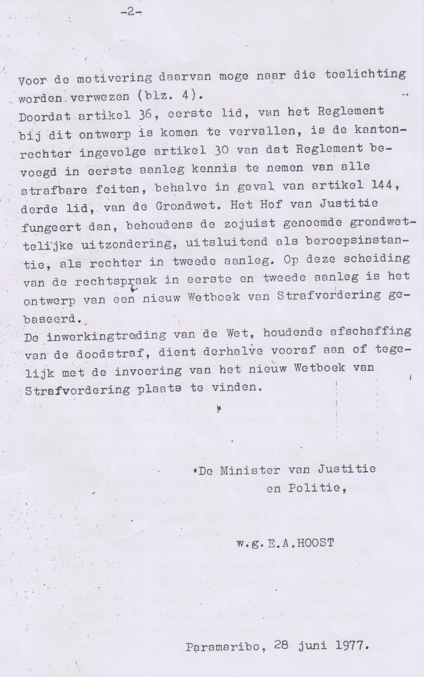 Naar aanleiding van voornoemd artikel bied ik u de memorie van toelichting van minister E.A. Hoost tijdens de behandeling van de wet ‘houdende afschaffing van de doodstraf’ aan. De heer Hoost is erudiet op het gebied van strafrecht. Ik wil u in de geest terugbrengen in de vergaderzaal van de Staten van Suriname, bij de openbare vergadering van het college op 17 juni 1977. Door verschil van mening tussen de oppositiepartijen, werd de vergadering op verzoek van de heer H.A.E. Arron voor onbepaalde tijd geschorst.