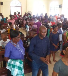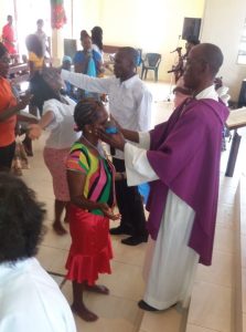 De eucharistieviering van zondag 7 april was niet alleen maar de dienst van het Woord en de dienst van de Tafel, maar tussendoor was er ook de dienst van bevrijding. Het is als het ware dat men met Gods Woord in ons hoofd onderzoekt ‘hoe is mijn relatie met God?’ Een soort ‘interioriseren’ van hetgeen men in de dienst van het Woord heeft gehoord. Jong en oud, seniorenburgers, jongeren, kinderen worden al vroeg hiermee opgevoed.