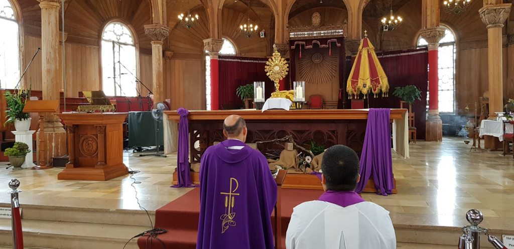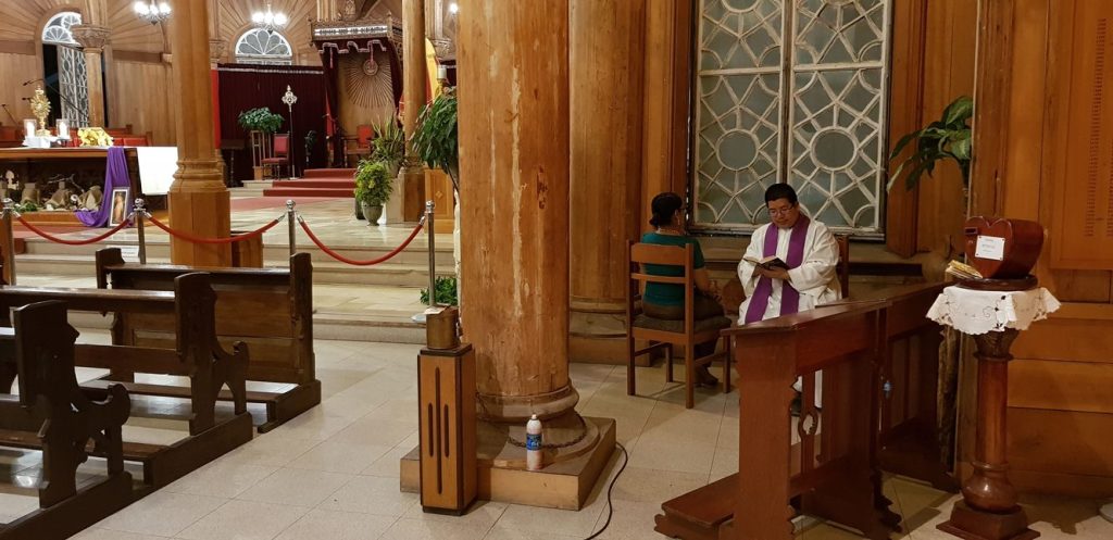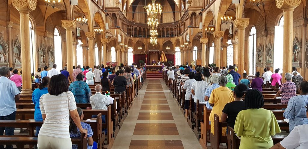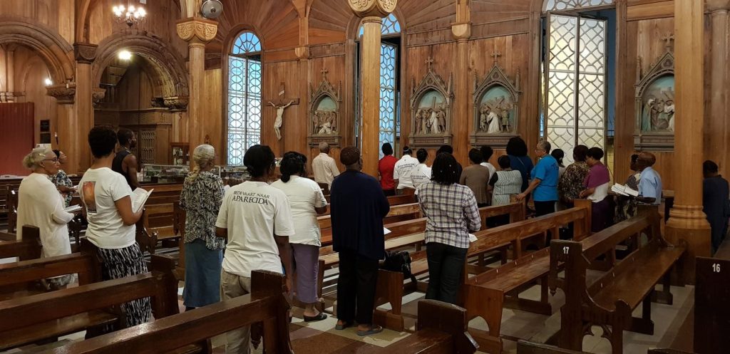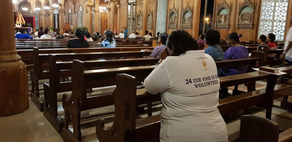 Paramaribo – “24 Uur voor de Heer. Vandaag is de dag van de genade.” Met deze woorden opent plebaan Esteban Kross het jaarlijks evenement op vrijdag 5 april jl. in de kathedrale basiliek. Van twaalf uur vrijdag tot twaalf uur de volgende dag krijgen groepen en parochies elk een half uur om voor te gaan in gebed. Behalve dat de kerk een etmaal open is, biedt 24 Uur voor de Heer ook de gelegenheid om het Sacrament van de biecht te ontvangen. Daarvoor staan de stoelen in de hoeken van de kathedrale basiliek. Pater Guillaume Woei A Jin verricht de lezing uit het Heilig Evangelie. “Is dat niet de man die wordt gezocht, maar zie hem in het openbaar spreken! Zou dat betekenen dat de overheid hem erkent? Geen mens weet waar hij vandaan komt!” zeggen enkele Jeruzalemmers tegen elkaar. Kross in zijn preek anticiperend hierop: “24 Uur voor de Heer is een goede voorbereiding op Pasen en de Goede Week – de kern van ons christelijk geloof. Volgens zijn geboorte is het duidelijk waar hij vandaan komt, maar wij kunnen niet binnen dringen in de Goddelijke geheimen wie God is, zolang hij zich niet openbaart. De Vader heeft hem gezonden, hiervoor is hij gekomen, voor het probleem van onze zonden en het kwaad.”