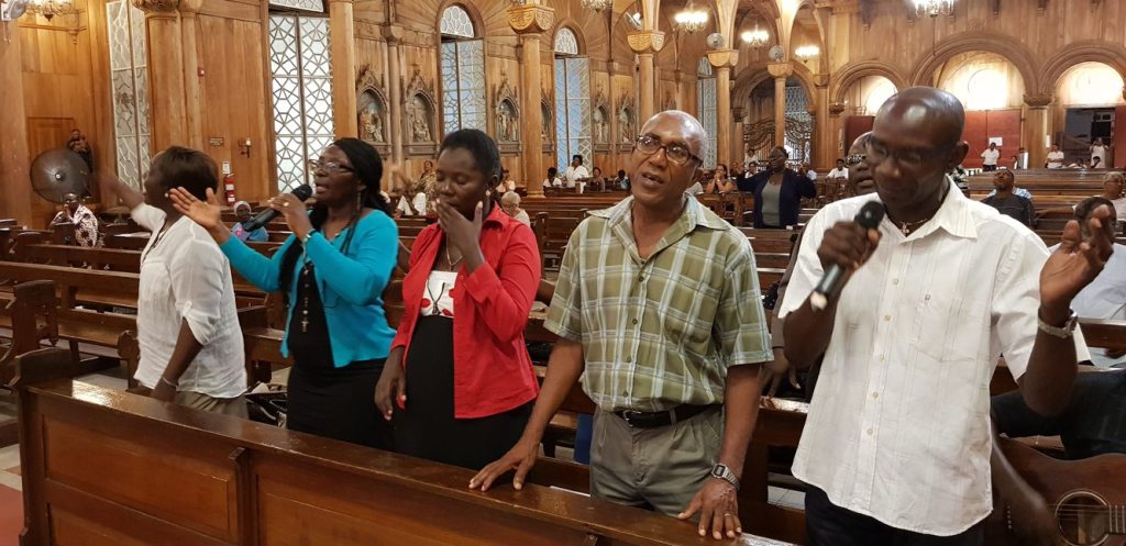 Onder de groepen en individuen die presenteren zijn ook leden van de Haïtiaanse gemeenschap in Suriname. ‘Groepsvertegenwoordiger’ Jolanda Joseph Cormier geeft aan dat in Haïti ook hetzelfde wordt gedaan, alleen gebeurt dit niet een etmaal maar tot de avond. “Misschien bij voldoende belangstelling dat men doorgaat tot de volgende dag, want door de situatie in Haïti gaan de mensen in de avond de straat niet op. Wie dan in de kerk is, blijft tot de volgende dag maar niet iedereen wil dat. Het is niet zoals hier, waar men zo vrij is om te komen en gaan in de late uren.” In de avonduren groeit weer het aantal bezoekers en ‘blijvers’. Gezinnen nemen ook de moeite om te komen. Er bestaat ook de gelegenheid om intenties te schrijven en deze in de gebedendoos te deponeren. Elk half uur klinkt weer een andere stem door de draadloze microfoon die voorgaat in een reflectie, rozenkrans, kruisweg of smeekgebed – zonder dat je een persoon ziet. “Er staat niemand voorin, ook geen priester, want we richten ons tot het Allerheiligste,” zegt een vrijwillige medewerker.