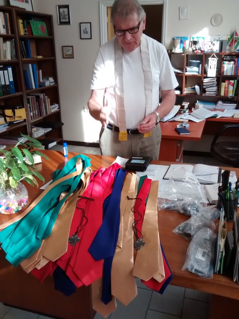De dienst in de Driekoningenkerk was toch al bijzonder doordat de communiebedélers voor het eerst een stropdas droegen in de liturgische kleur van die dag. Vanwege het feest van de Heilige Drieëenheid was de kleur deze dag wit. De dames hadden reeds langer een sjaal in de betreffende liturgische kleur. Allen ontvingen nu ook een medaille om tijdens de uitoefening van hun dienst te dragen, waarop duidelijk zichtbaar de vijf broden en twee vissen uit Johannes 6, 1-15: Jezus geeft vijfduizend mensen te eten. De medailles symboliseren de uitreiking van de communie door de communiebedélers, zoals eens de apostelen Jezus behulpzaam waren. Daags tevoren werden stropdassen en medailles gezegend.
