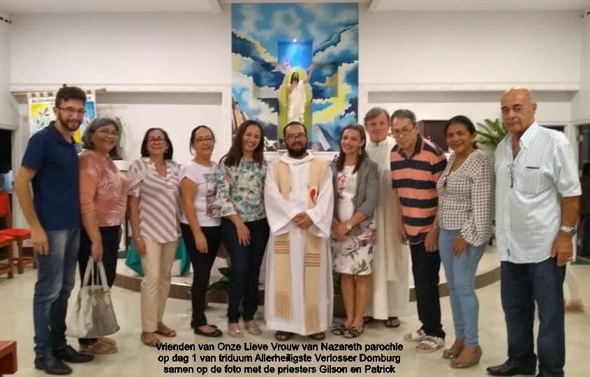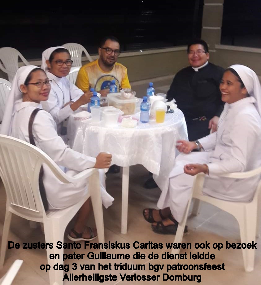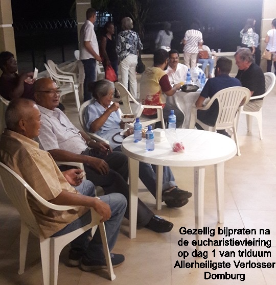Ik heb de eerste dag van het triduüm van onze parochie bijgewoond, een driedaags feest van de Allerheiligste Verlosser de patroonheilige van onze kerk, met elke avond een eucharistieviering die afgesloten werd met een fundraising. De parochianen doneren drinken of maken lekkere hapjes die verkocht werden. Zo hadden we na afloop ook even een gezellige get-together om bij te praten en een mooie opbrengst voor de parochie. Op deze eerste eucharistieviering celebreerde monseigneur Karel Choennie. Onze pastoor pater Gilson en zijn confrater pater Patrick van de Onze Lieve Vrouwe van Nazareth waren zijn mede-celebranten.