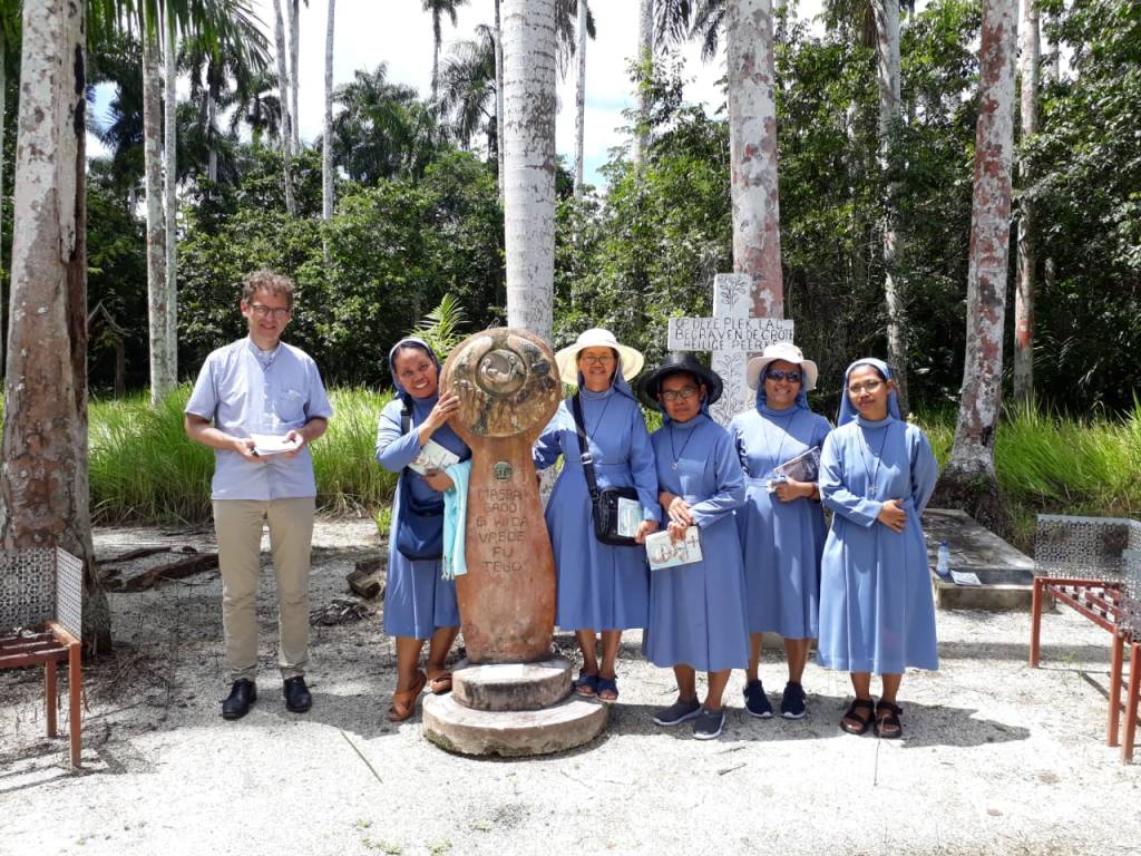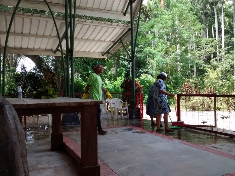 Na het gebed door pater Norbert voor een werkzaam, devotievol en veilig verblijf in Batavia gaan de twee groepen hun eigen weg. Pater Norbert en de zusters bezichtigen het museum in het pelgrimshuis en vervolgen daarna met kruiswegviering gebruikmakende van de Bataviaboekjes. Na een kort overleg in de andere groep vangen ook de schoonmaakwerkzaamheden (vegen, wassen, drogen, poetsen) aan in de diverse locaties – kerk, pelgrimshuis, paviljoens – en op het terrein (snoeien, harken, opruimen); de honderden gevallen roodborstjes (manja’s) worden ook opgeruimd.