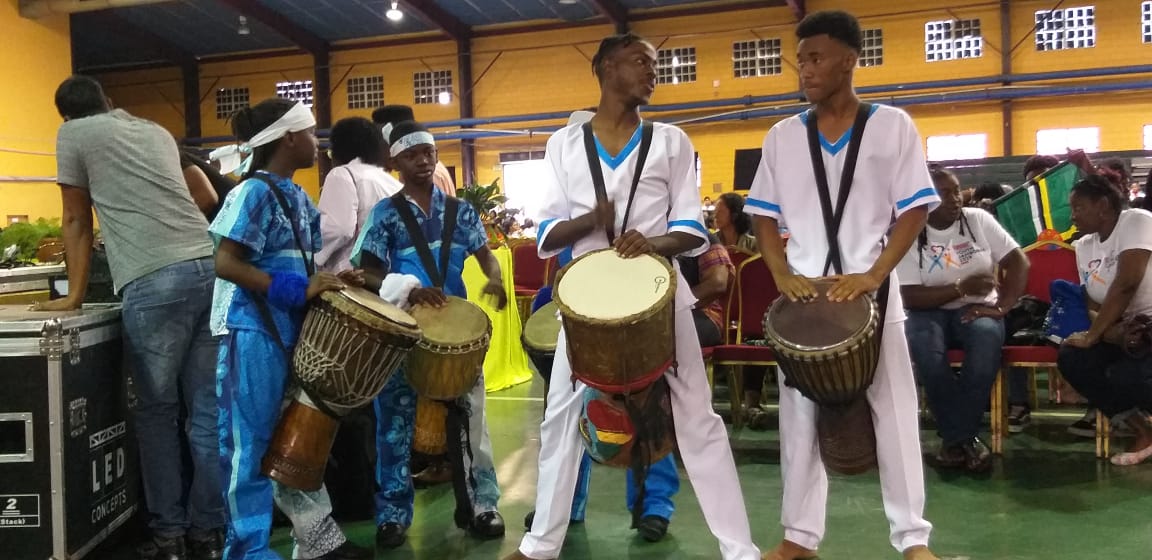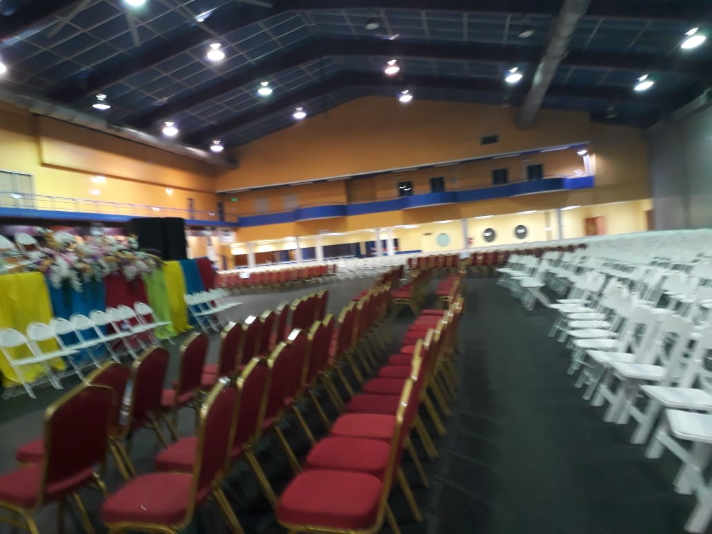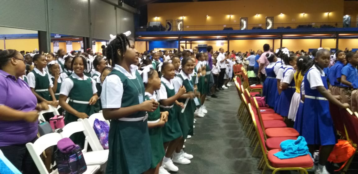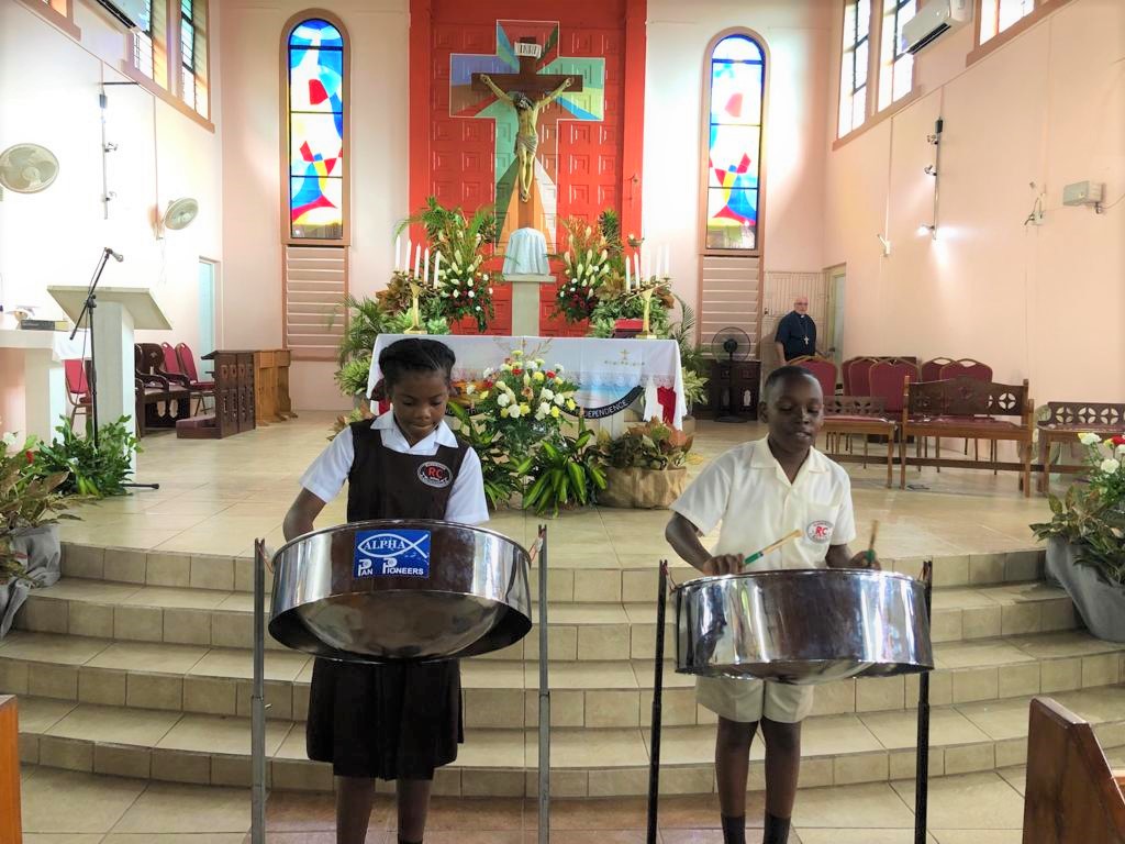 Twee gigantische hallen waren compleet bezet met stoelen. Er stond een prachtig aangekleed podium waar vooral een constructie, een grote duif boven een soort fontein, als centerpiece de aandacht trok. In een hoek van de zaal speelde een groep studenten op een steelband en bracht meteen de goede sfeer erin. De sfeer werd alleen maar beter bij het arriveren van de schoolkinderen, allemaal heel netjes in hun mooie uniformen. De jonge energie die er van ze uitging was voelbaar.