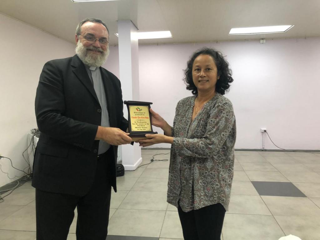 Gisteren, zaterdag 21 september, heb ik geen verslag gedaan, het was een lange dag. We hadden twee presentaties: van pater John Persaud uit Guyana en bisschop Clyde Harvey van het bisdom St.-Georges, Grenada. In de avond was er een diner waarbij de PMW directors van alle bisdommen een plaquette kregen vanwege hun deelname aan dit eerste missiecongres. Ook medewerkers en sponsors werden bedacht. Het was een aangename verrassing dat vertrekkende directors – waaronder ik – ook een aandenken kregen ten teken van waardering voor het werk dat ze hebben verricht. Wat een mooie attentie!