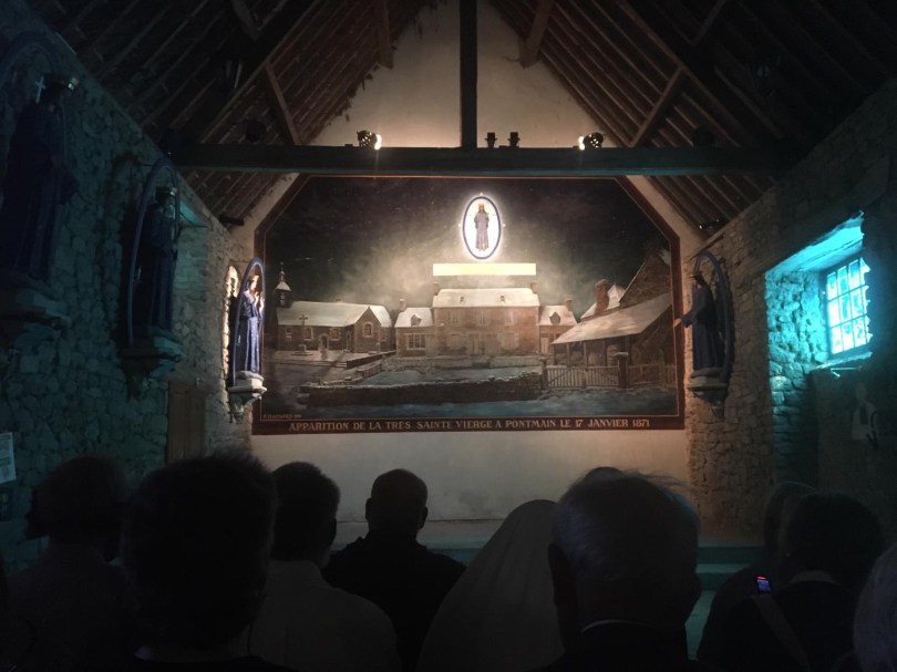 Heel vroeger, in mijn studietijd, heb ik de naam Pontmain vaak gehoord. Dat is een plaats in Frankrijk en daar woonden veel oblaten. Ik hoorde dat daar oblaten zijn overleden. De naam intrigeerde mij zo, dat ik eens ben gaan googelen en ontdekte dat daar Maria is verschenen en dat een van de 4 zieners een jongetje was van 10 jaar die later oblaat is geworden: Joseph Barbedette. Daar wilde ik graag het mijne van weten en zo gingen wij – Cor, Nel en ik – dus vanuit Bayeux naar Pontmain. Bayeux is een plaats in Normandië die een belangrijke rol speelde op 6 juni 1944, in de geschiedenis beter bekend als D-Day. Pontmain ligt op een afstand van 300 km van Bayeux en we kwamen aan in een rustig, landelijk dorpje met voor het dorp een geweldige kerk, een basiliek, op 150 meter afstand van de parochiekerk. Op dit moment heeft het dorpje slechts 885 inwoners. In Pontmain wonen er nog enige oblaten en ze hebben de verantwoordelijkheid over zowel de parochiekerk als de basiliek Notre Dame de l’Espérance. Maar de meeste zijn bejaard en niet meer actief in het apostolaat. Ik begreep dat er ongeveer 16 oblaten daar wonen in een soort bejaardentehuis voor hulpbehoevende oblaten.