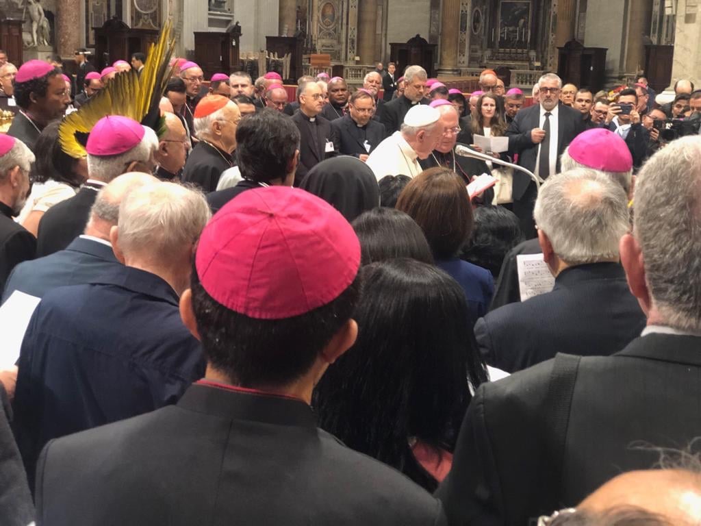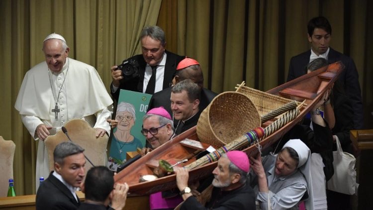 De synode voor de Amazone ging van start met een processie vanuit de Sint-Pietersbasiliek naar het plein en vervolgens in de hallen waar de synode wordt gehouden. In zijn openingswoord zei paus Franciscus dat deze bijzondere synode vier dimensies omvat: een pastorale, culturele, sociale en een ecologische. Hij zei dat de pastorale dimensie de belangrijkste is, ‘die ene die alles omvat. Wij moeten deze synode ingaan met een christelijk hart en de realiteit van de Amazone zien met de ogen van een discipel. Alleen dan’, aldus de paus, ‘kunnen wij het begrijpen en interpreteren. De pastorale dimensie stelt ons in de gelegenheid om de volken van de Amazone te benaderen met respect voor hun geschiedenis, culturen en hun manier van leven. Omdat alle volken hun eigen wijsheid, bewustwording, hun eigen belevenis van de realiteit hebben’.