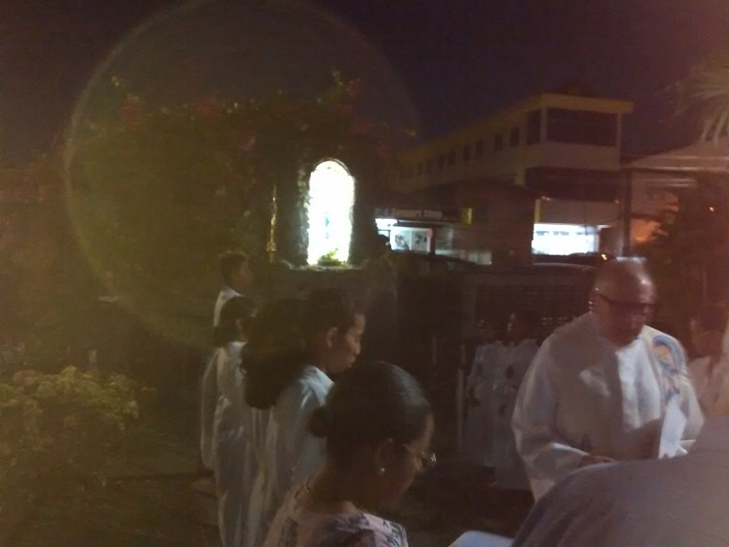 Na het zingen van het slotlied – Zie ons hier verzameld – trok de processie naar de prachtige Mariagrot op het kerkplein. Onder kunstlicht werd daar een tientje gebeden voor spoedige beterschap van pater Kumar. Na de Salvatoriaanse beurtzang en het bidden van de aanroepingen sloot pater Jan deze viering af met de zegen en de zending.