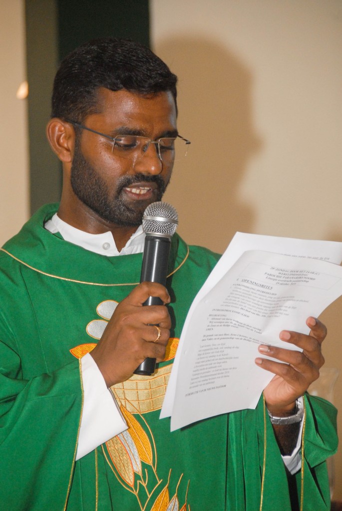Klokslag 18.00 uur begon de intredeprocessie onder het zingen van het intredelied, waarna de begroeting. Hierna volgde conform het kerkelijke protocol de aankondiging van de nieuwe pastoor door parochieraadslid tevens parochieassistente Marlène aan de vicaris-generaal. Na het uitspreken van zijn gelofte en de geloofsbelijdenis werd de benoemingsbrief door Marlène voorgelezen. Op verzoek van pater Esteban strekten de aanwezigen hun rechterarm uit richting pater Kumar en werd gezongen ‘Laat uw adem Heer komen over hem’ als zegen voor zijn benoeming. Pater Jan overhandigde de kerksleutels aan de vicaris-generaal, die ze op zijn beurt doorgaf aan pater Kumar. Met het gezamenlijk luiden van de kerkklokken (in de sacristie) werd de benoeming formeel bevestigd. Een langdurig applaus door de aanwezigen volgde hierna als teken van hun instemming. Het luiden van kerkklokken is de symbolische uitdrukking van de verkondigingstaak van de nieuwe pastoor, samen met zijn parochieassistenten. De lezingen van deze avond, derde weekend in oktober – Wereldmissiedag – waren achtereenvolgens Ex. 17, 8-13: ‘Mozes hield zijn armen omhoog geheven’, waarna psalm 121: ‘Mijn hulp zal komen van God de Heer’, gevolgd door de lezing 2 Tim 3, 14-4,2: ‘Verkondig het woord, te pas en te onpas’ en het evangelie Lc. 18, 1-8: ‘Zou God geen recht verschaffen?’