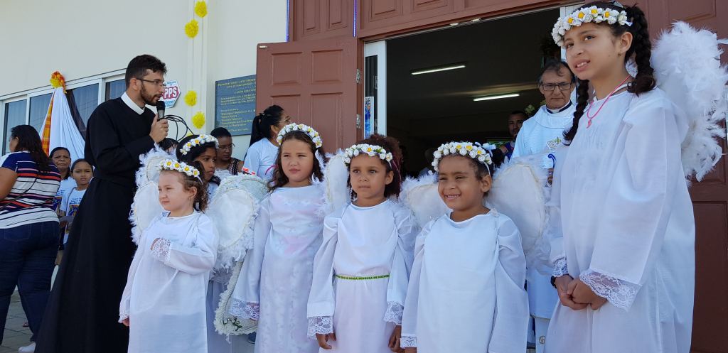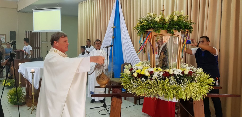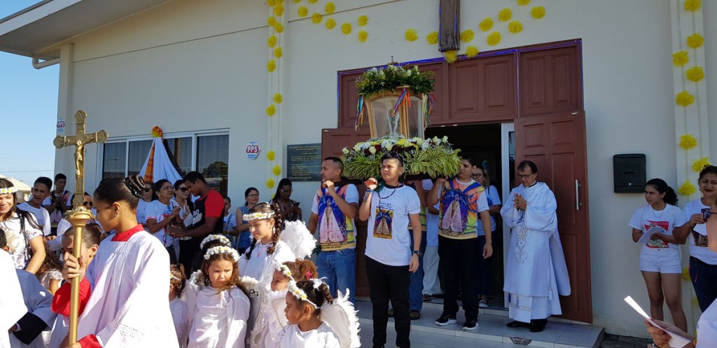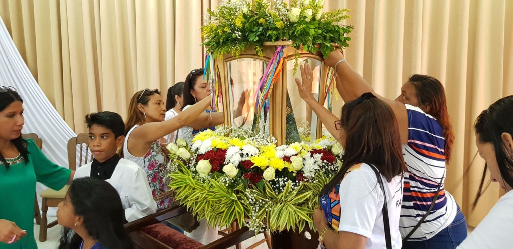 Een groepje kinderen gekleed als engelen ging voor in de processie. Op de drager gedragen door vier personen rustte de berlinda met daarin een replica van de Círio. Dit beeld, dat in 2017 werd geschonken aan Suriname, komt officieel van de Basílica Santuário in Belém. Op deze locatie, in de ‘Gloria’ boven het altaar, wordt het originele beeld bewaard. In 1793 werd het beeld langs een kreek in het bos gevonden. De vinder bracht het naar huis, maar de volgende dag was het beeld verdwenen. Na lang zoeken besloot de man terug te gaan naar de plek waar hij het beeld had gevonden en daar lag het beeld. Dit zou nog twee keren gebeuren. Na goedkeuring van Rome werd de eerste bedevaart begin negentiende eeuw gehouden. Vele wonderen worden aan dit beeld van moeder Maria met kindje Jezus op de arm toegeschreven.