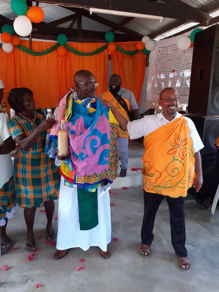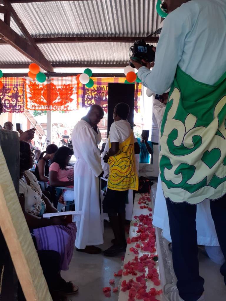 Het was een heel mooie dag en de sfeer zat er goed in. Wij werden verwelkomd in een kleurig en fleurig versierde zaal met ballonnen en voornamelijk creatief geborduurde culturele kledingstukken. De opkomst was heel goed. De aanwezigen waren zelf een lust voor het oog met nauwkeurig uitgekozen kleding. De pater trok zich terug met de catechisten en misdienaars die hem bij deze dienst zouden bijstaan. Zij bereidden zich voor en gingen als groep in gebed. De aanwezige catechisten waren Steven Linga uit Gengeston, Herman Wee Wee en Vera Linga uit Pambooko, Godfried Adjako en Frans Adjako uit Kaajapaati, Gabriel Finisie en Renfried Dieko uit Jaw Jaw. Verder waren ook familie en vrienden uit andere dorpen en uit Paramaribo aanwezig.