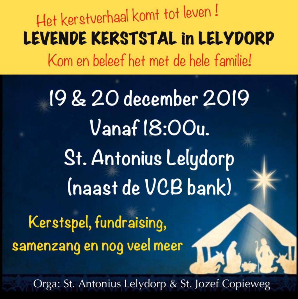 Op donderdag 19 en vrijdag 20 december a.s. wordt in Lelydorp het kerstverhaal weer tot leven gebracht. De voorbereidingen zijn in volle gang. De gemeenschap van Lelydorp en omgeving kan een sprankelende opvoering van het kerstverhaal verwachten. De bezoekers zullen zeker genieten van de talenten van de kinderen. Ook samenzang is onderdeel van het programma. Het evenement heeft verder een fundraisingskarakter voor zowel de St.-Jozef- als de St.-Antoniuskerk. Op beide dagen zullen er heerlijke gerechten, verrukkelijke snacks en koele dorstlessers verkrijgbaar zijn. Dankzij de mooie samenwerking tussen de parochianen van beide kerken mogen de Lelydorpers en anderen het kerstverhaal op een unieke manier beleven. Onder de kundige leiding van de zusters Odile en Paulien van Fransiskus Charitas en pater Fransiskus mogen wij dus de kerstsfeer in Lelydorp brengen en de mensen aansporen het kerstverhaal een plaats te geven in hun kerstviering, waarin het kindje Jezus een bijzondere plaats inneemt. Proef de sfeer van kerst en kom allen naar de levende kerststal op het terrein van de St.-Antoniuskerk in Lelydorp. De aanvangstijd op beide dagen is 19.00 uur.