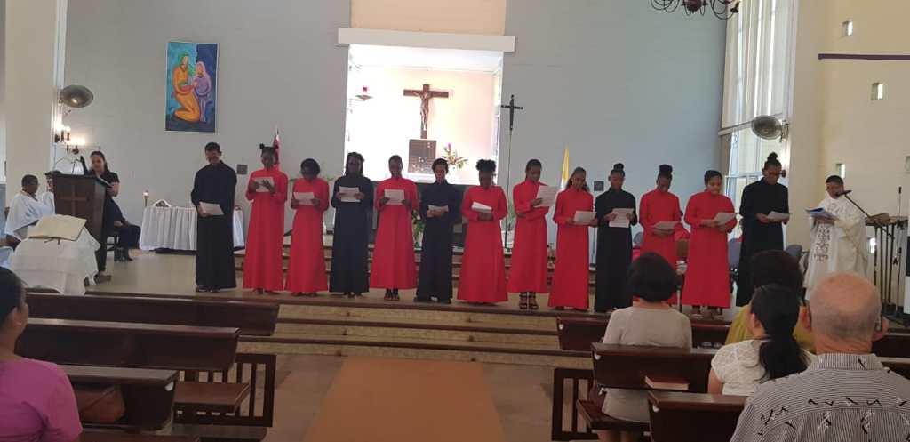 Misdienaars en acolieten van de H. Familieparochie hebben op 24 november jl. op het hoogfeest van Christus Koning hun belofte afgelegd of vernieuwd. Dit hebben ze gedaan na training van pater Guillaume Woei A Jin. De hele groep bestaat uit 27 misdienaars. De nieuwelingen zijn nog bezig training te volgen. Elke 2e vrijdag komen ze bijeen om lessen in de vorm van bijbelstudie, sociaal contact en bezinning te volgen en zich zo te vormen. Tijdens deze bijeenkomsten leren ze ook over het misdienaar-zijn, wat het inhoudt en over het kerkelijke vaatwerk en de liturgische kleden. Ik behoor tot de groep die de nieuwelingen traint. Ik ben 17. Ik ben Ewagana Holland.