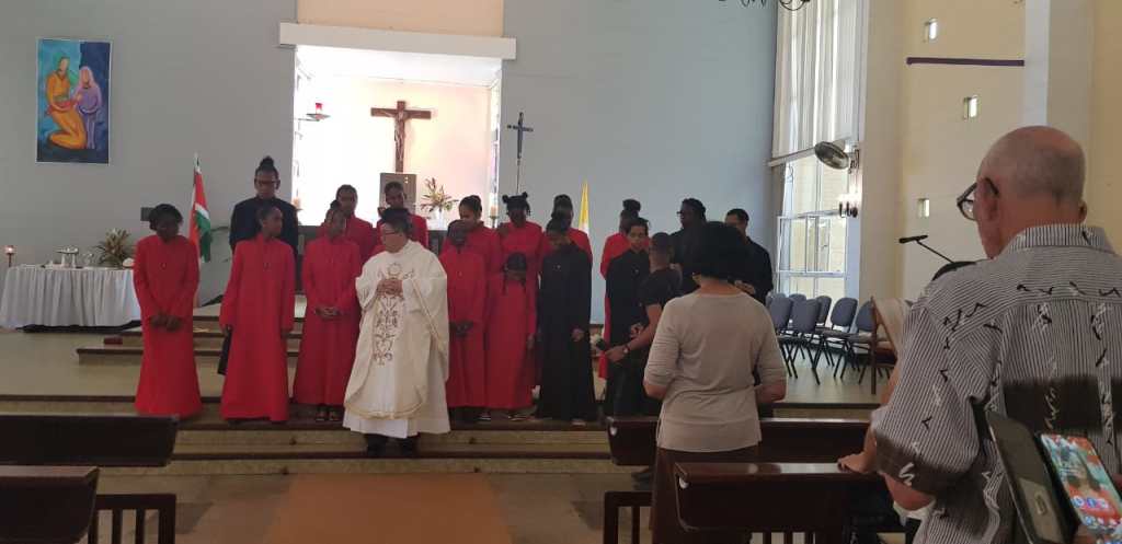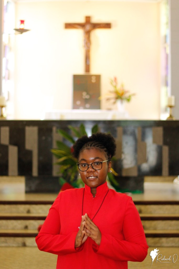 De grote dag van 24 november was vrij rustig verlopen. Na de preek werden de oude misdienaars naar voren geroepen en daarna volgden de 3 nieuwe misdienaars. De oude misdienaars moesten hun belofte hernieuwen en de nieuwe misdienaars hun belofte zeggen. Er werd handoplegging gedaan door pater Guillaume. Wij kregen een kruis als teken van het misdienaar-/acoliet-zijn en daarna werden wij aan de kerkgemeenschap voorgesteld. Ik had vol verlangen naar deze dag uitgekeken. Het is een mijlpaal en ik ben trots op mezelf deze bereikt te hebben. Bij deze bedank ik God, pater, mijn moeder en peetmoeder die me altijd hebben bijgestaan. Zij hadden me gevraagd of ik bereid was om God te dienen.