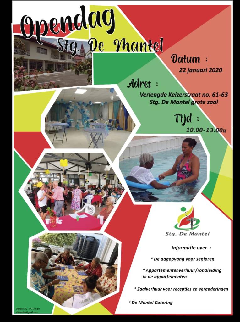 Om meer bekendheid te geven aan het werk van De Mantel en meer vrijwilligers en sponsors te interesseren om dit werk te ondersteunen, organiseren wij van stichting De Mantel op woensdag 22 januari a.s. een opendag. Op deze dag zullen wij informatie verstrekken over onze dagopvang, onze activiteiten alsook onze dynamische toekomstplannen. Stichting De Mantel is een non–profit organisatie die als doel heeft het bieden van professionele opvang en verzorgings- en recreatiemogelijkheden voor seniorenburgers. Zij tracht haar doel te bereiken door o.a. het bieden van activiteiten in de dagsoos aan seniorenburgers tegen een geringe vergoeding, het verhuren van appartementen voor permanent verblijf aan seniorenburgers die veilig, maar ook zelfstandig willen wonen en het verhuren van vergaderzalen aan derden. Een substantieel deel van de opbrengsten van de appartementen- en zaalverhuur wordt besteed aan de financiering van de dagopvang. Hierdoor trachten wij de toegang tot de dagsoos voor eenieder toegankelijk te maken. De dagopvang is bestemd voor mensen die op oudere leeftijd lichamelijk en mogelijk ook geestelijk achteruitgaan, maar nog een redelijke mate van zelfstandigheid bezitten. De bedoeling van de dagbehandeling is het geestelijke, lichamelijke en sociale functioneren van de seniorenburgers te bevorderen. Daardoor kunnen ze zich langer zelfstandig thuis handhaven, waardoor opname in een verpleeghuis of verzorgingshuis wordt uitgesteld of voorkomen. De dagopvang is van maandag tot en met vrijdag geopend van 07.00 – 15.00 uur. De seniorenburgers worden om 8.00 uur verwacht en worden tussen 13.30 – 14.00 uur opgehaald.