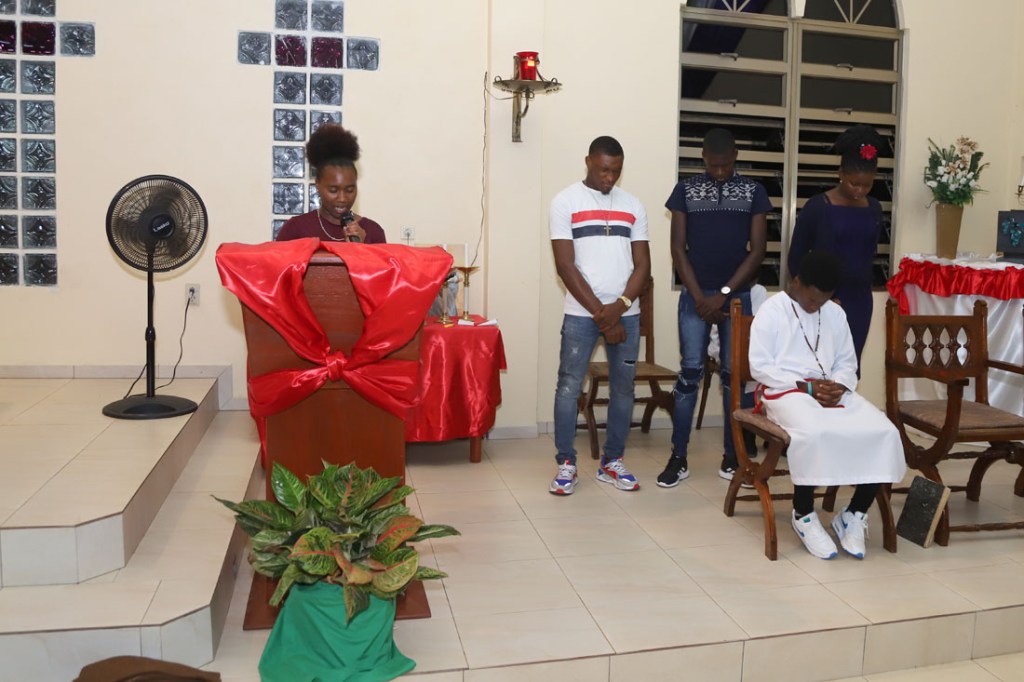 “We zijn bijzonder blij dat de Katholieke Jongeren Suriname (KJS) besloten hebben hun opoyariviering hier in Moengo te houden,” zei Clyde Abiteng in zijn welkomstwoord en bij de introductie van de KJS tegen de volle kerkzaal in de St.-Theresiakerk, Moengo op zaterdag 11 januari jl. “We voelen ons vereerd dat KJS de tijd genomen heeft om naar onze geloofsgemeenschap te komen om hier samen met ons het geloof te beleven en ons te vertellen over haar planning.” Clyde vertelde hoe deze opoyariviering tot stand is gekomen en riep de stuurgroep van de KJS naar voren zodat eenieder kon zien over wie hij het had. De aanwezigen klapten enthousiast.