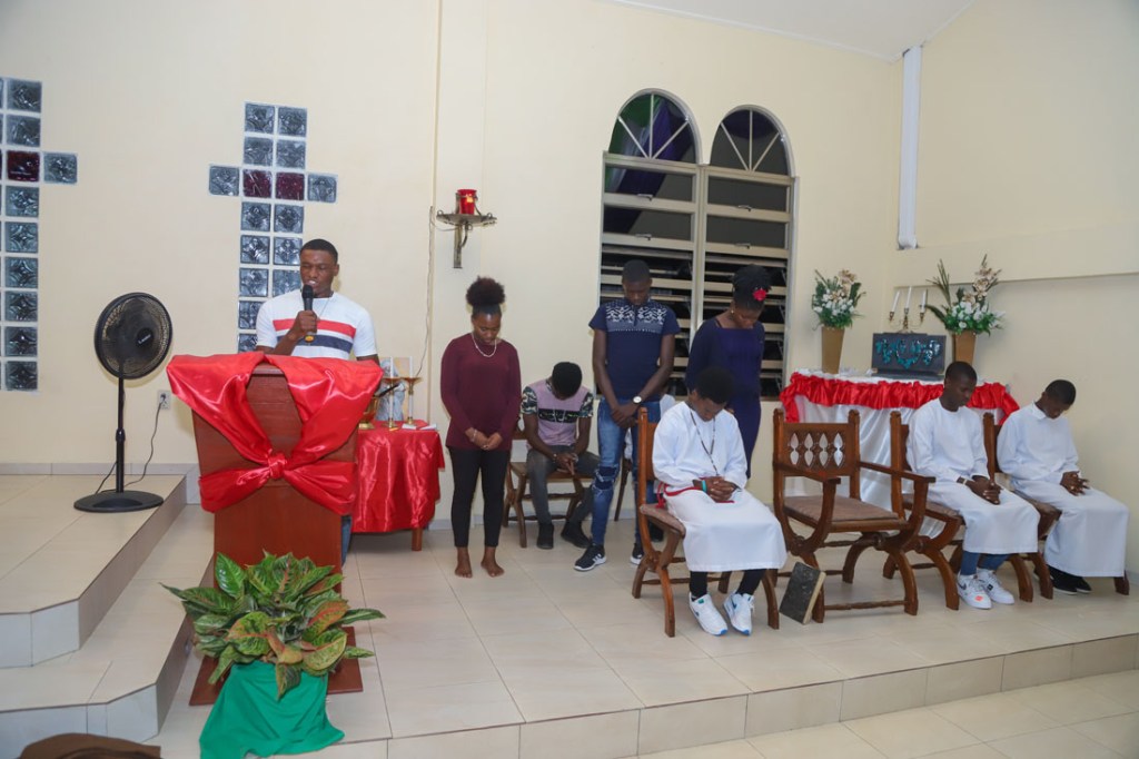 Het praiseteam bestaande uit vrouwen en twee mannen om de muziekinstrumenten te bedienen, zette aan het begin van de viering de juiste toon in. Op dat moment had de intrede van priester en misdienaars nog niet plaatsgevonden. De zaal was ook nog niet vol. Maar iedereen stond op en begon spontaan mee te zingen en te dansen. De 15 minuten durende intrede gebeurde ook swingend en beloofde veel voor de rest van de avond. Indien je er wat stijfjes bij stond, was je aardig los na dat kwartiertje, of je nu een parochiaan was van de St.-Theresiakerk of uit Paramaribo kwam. Het was aanstekelijk, gezellig en gastvrij. Het zou een woord- en gebedsdienst zijn, maar pater vond een eucharistieviering op zijn plaats, ook omdat het zijn eerste dienst was in 2020 in deze gemeente. Pater was een dag eerder teruggekeerd van een charismatische conferentie in Trinidad.