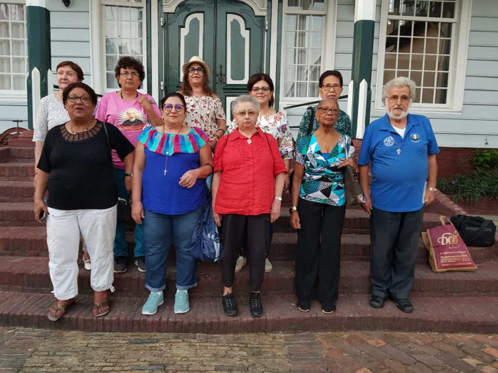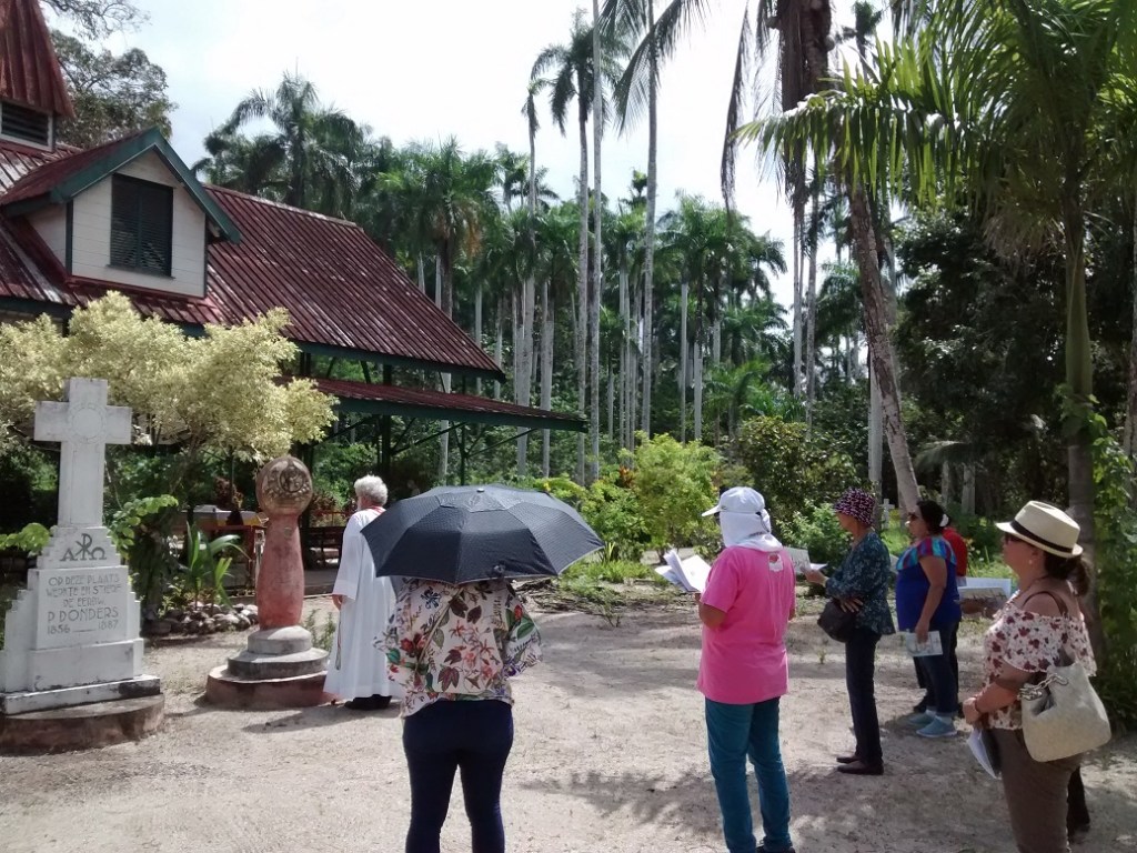 De boottocht van Boskamp naar Batavia is ook altijd boeiend. Deze keer waren we in een (onoverdekte) boot voor maximaal 13 personen met een 15pk aanhangmotor. Bootsman Andy voer niet ver van de oever in een matige snelheid. Je kon dan genieten van Gods schepping: het Coppename-oerwoud, deel van het immense Amazoneregenwoud. Vooral de prachtige mangrovevegetatie (de luchtwortels) valt op. Indrukwekkend en bewonderenswaardig allemaal. Op Batavia genoten wij van de prachtige fluitconcerten van de vogels – papegaaien en parkieten -die (hoog) in de bomen huizen. Het fluiten ging zonder onderbreking door tot na ons vertrek. Tijdens de kruiswegviering onderbrak pater Noordermeer de tocht om enkele momenten te luisteren naar het gefluit.