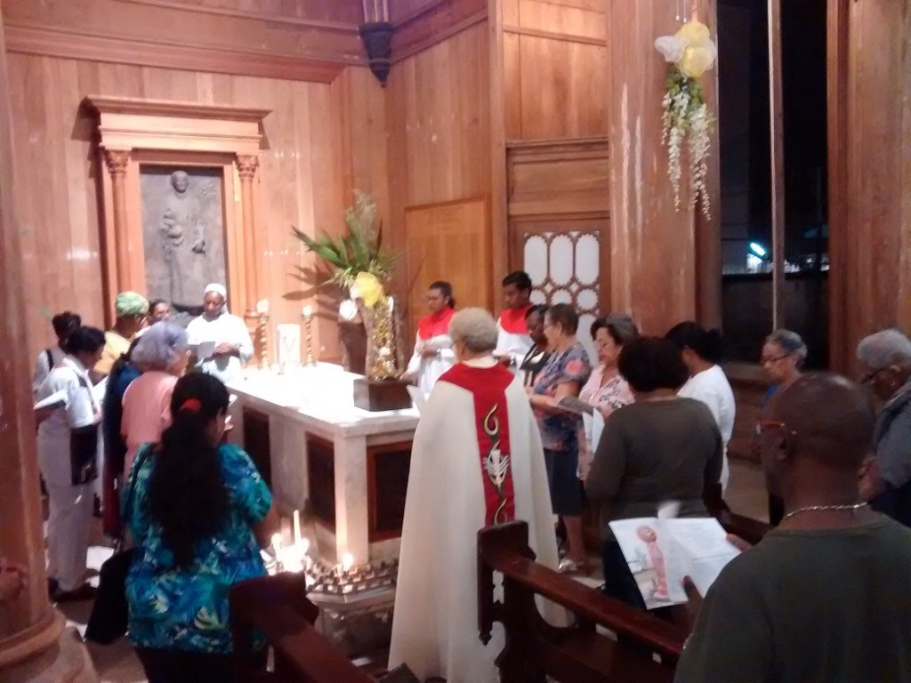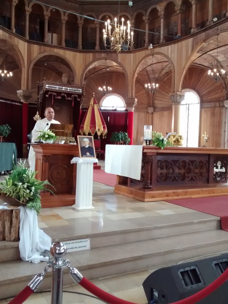 Op 14 januari – de sterfdag – waren er twee eucharistievieringen. Om 06.30 uur ging pater Noordermeer voor in de dienst en om 12 uur was er een eucharistieviering waarin pater Kross voorging. Beide priesters belichtten het leven en de werken van onze zalige Petrus Donders in relatie tot lezingen van de dag. Na de dienst gingen de aanwezigen (ruim 50 personen in de ochtendviering en 35 in de middagviering) naar zijn prachtige graftombe voor stil gebed of om er een kaarsje te branden. Later in de vooravond, in de Antonius’ lofviering in de St.-Rosakerk heeft pater Noordermeer ook aandacht besteed aan Petrus Donders. De zalige Petrus Donders was voorwaar een bijzondere dienaar Gods die zich ten volle gaf aan de armen en de ernstig zieke melaatse medemensen. Zo kwetsbaar als hij was heeft hij toch 45 jaar lang gearbeid in ons geliefd land. In de stad en in het district Coronie waren het in totaal 18 jaren en op Batavia 27 jaren.