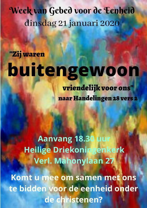 Middels een prachtig gekleurde flyer werden de christenen en andere belangstellenden van de cluster Noord, omvattende de EBGS-gemeenten van de Combé, Duta Wajana, Rogatekerk, kerk Geyersvlijt en de r.-k. parochie Noord, van harte uitgenodigd voor het bijwonen van de oecumenische viering op dinsdag 21 januari jl. in de H. Driekoningenkerk aan de Verlengde Mahonielaan in verband met de Week van Gebed voor eenheid onder de christenen. Het thema voor de week was buitengewoon. Het materiaal voor dit jaar is voorbereid door kerken in Malta. De jaarlijkse gebedsweek vond plaats van 19 tot en met 26 januari 2020. Geïnspireerd door de buitengewone vriendelijkheid die in Handelingen 28 naar voren komt, daagt de Week van Gebed deelnemers uit om te streven naar meer dan het gewone. In het Bijbelboek Handelingen lezen we dat Paulus en zijn reisgenoten schipbreuk lijden op het eiland. Daar worden zij met buitengewone vriendelijkheid opgevangen. Deze gebeurtenis markeert het moment waarop het evangelie het eiland bereikt. In deze gebedsweek werden wij daarin meegenomen.