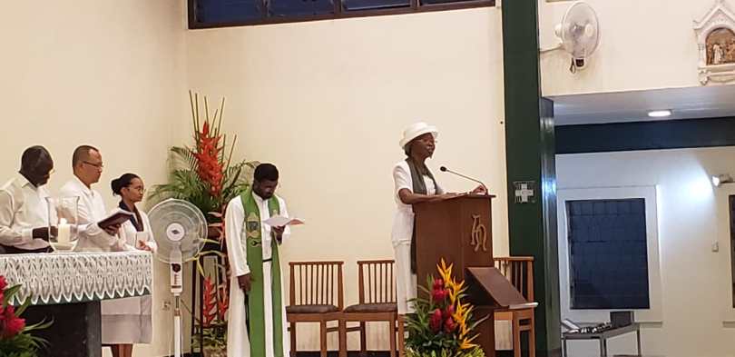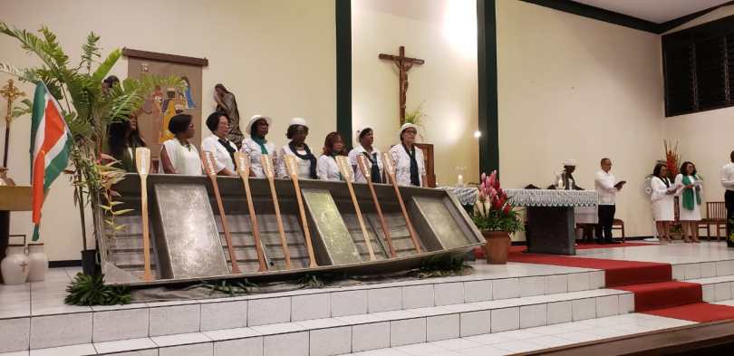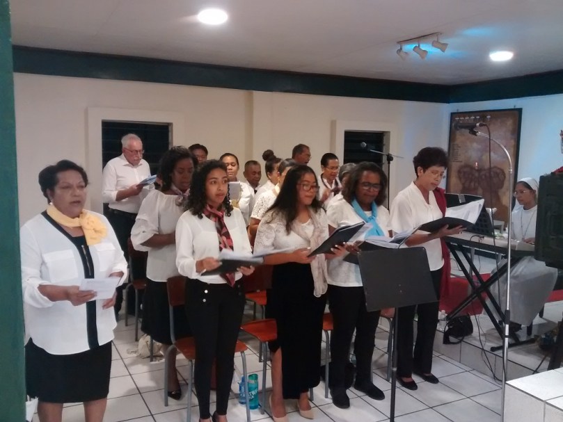 Onder het zingen van het intochtslied ‘Samen in de naam van Jezus’ liepen dominees, pater, lectoren, assistenten en vertegenwoordigers van de clustergemeenten in processie de kerk binnen. Het thema van deze 3e dag in de gebedsweek was HOOP. De orde van de dienst – voor de ruim 350 aanwezigen was deze goed te volgen in het overzichtelijke programmaboekje – werd vlot afgewerkt door de dominees Dave Pawironadi, Ingrid Nortan-Uden, Rudie Castillion en pater Kumar Irudayasamy geassisteerd door de zusters Astrid, Anne, Mariana en Danja. Het Salvatorkoor onder leiding van Sandra de Boer, op keyboard begeleid door zuster Christine FCh, luisterde de dienst op met prachtige koorzang en ondersteunde bij de samenzang. Voor de eerste keer heeft het koor het themalied ‘Bijzonder vriendelijk’ niet onverdienstelijk ten gehore gebracht. De lezingen van deze dienst: 1e lezing Hand. 27, 22 en 24, tussenzang Ps. 27 De Heer is mijn Licht en mijn Leidsman en de evangelielezing Mt. 11, 28 – 30.