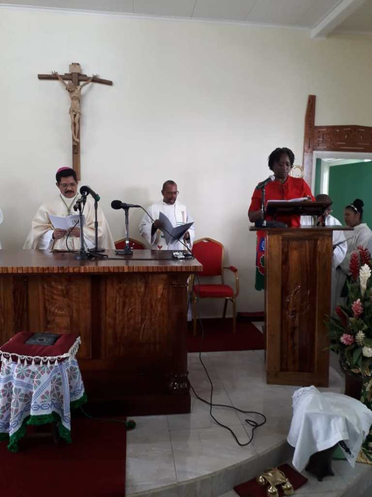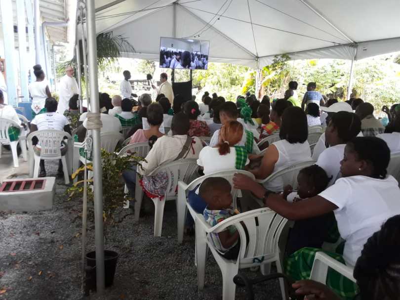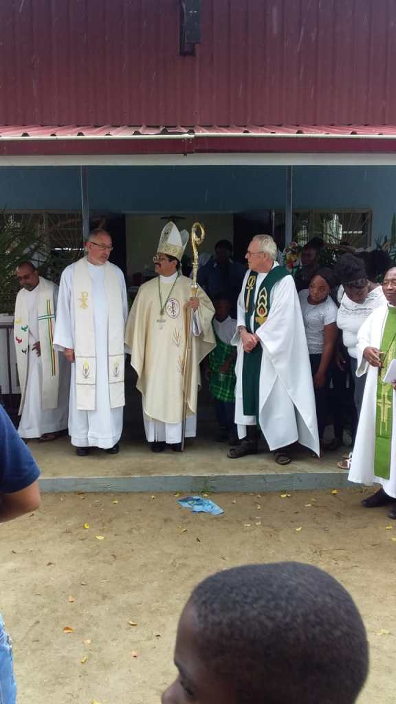 De bisschop werd in de viering ondersteund door verschillende paters. Opvallend was de samenwerking tussen de verschillende parochies bij deze unieke bijeenkomst. Tijdens de plechtige dienst galmde in het gebouw vooral Saramaccaanse muziek. Ondanks het natte weer genoot iedereen zichtbaar van de optredens en de sfeer. Na de plechtigheden werd het naambord en het logo van de kerk onthuld. Het logo beeldt uit dat het r.-k. bisdom de katholieke Saramaccaanse gemeenschap bij de handen pakt en verder versterkt en op weg helpt in geloof.