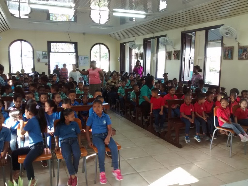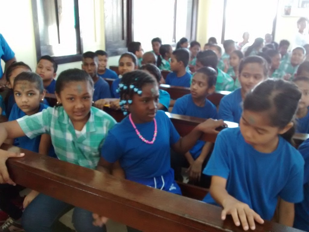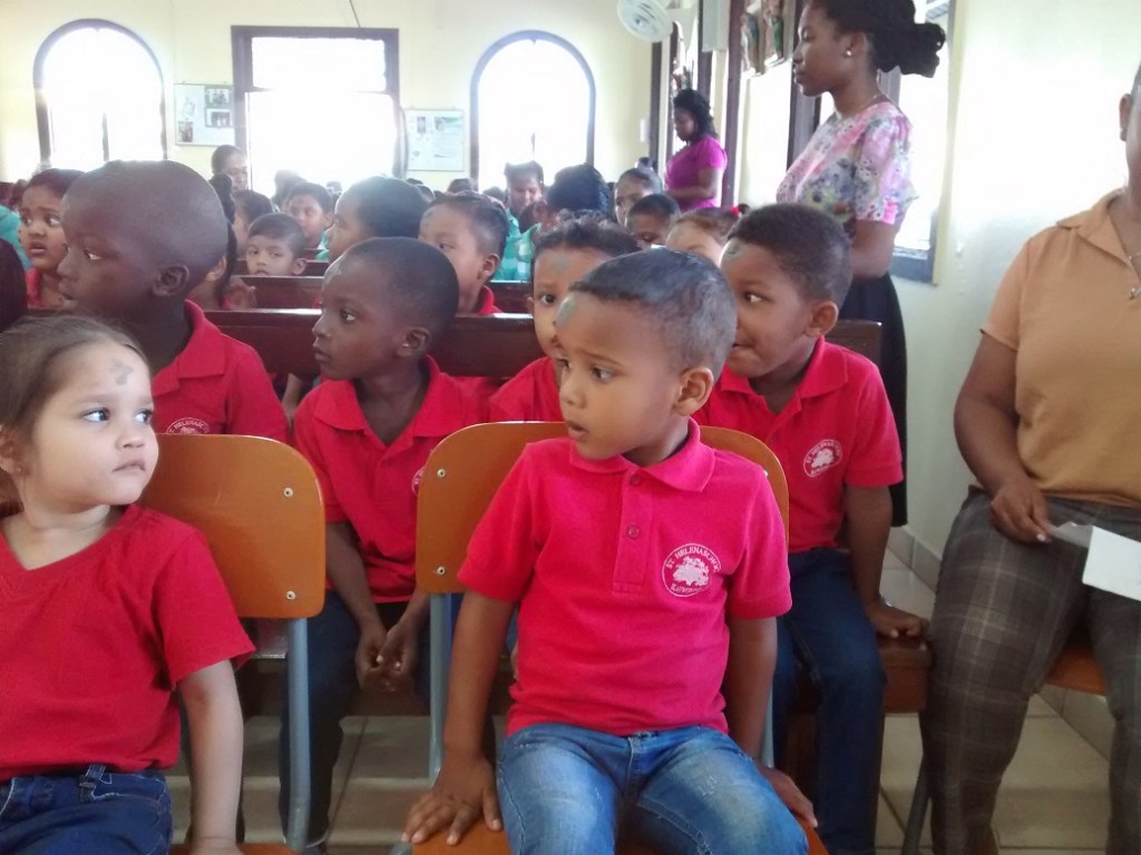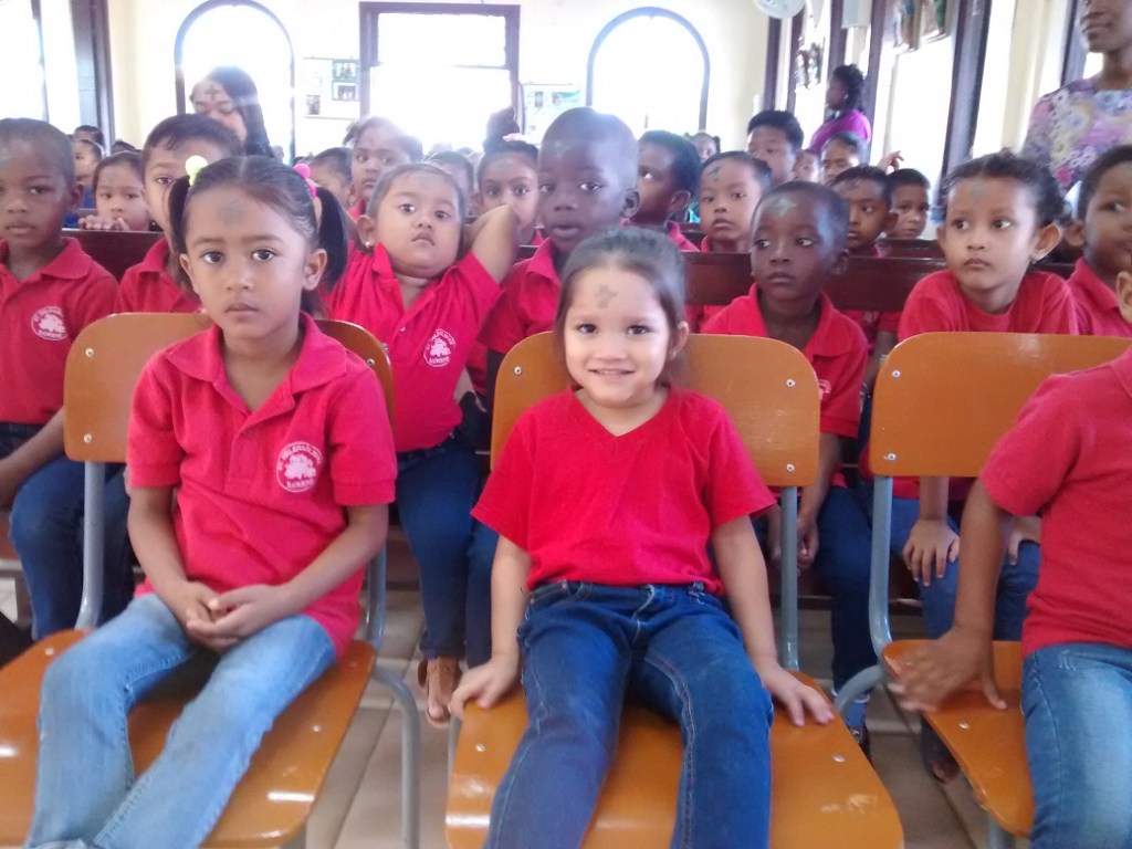 Straks bij het opleggen van een askruisje op jullie voorhoofd zullen wij – Wielfred en ik – zeggen: ‘Wees een vriend van Jezus’ en bij de leerkrachten en andere volwassenen zullen wij uitspreken: ‘Mens, gedenk dat gij stof zijt en tot het stof der aarde zult wederkeren’.” Na de zegen zongen de kinderen het slotlied ‘God van trouw’. Rond 9 uur keerden leerlingen en leerkrachten terug naar school. Dank aan schoolleider mevrouw Constance Ling en haar staf voor de vrome wijze waarop hun leerlingen zich hebben gedragen tijdens deze mooie en vlotte viering. Dank ook aan onze parochiemedewerkers de dames Carmen, Wagijem, Hendrina en Vidya voor hun bijdrage.