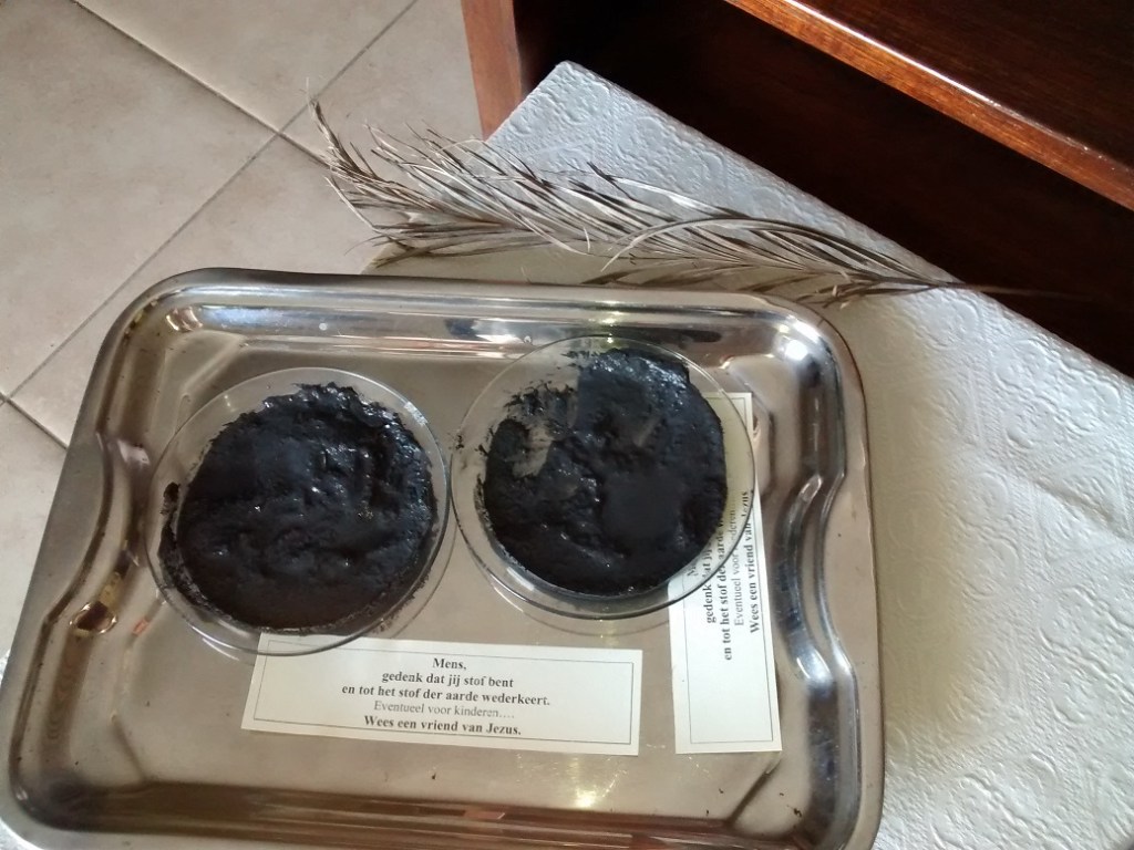 Zuster Kitty hield een korte bezinning: “Vandaag, Aswoensdag, is het begin van onze vastenperiode; een periode van veertig dagen waarin wij de ‘woestijn’ ingaan. In de woestijn is het dor en droog. Er is niet zoveel te eten en te drinken. Wij zullen het met minder moeten doen. Vasten noemen wij het en wij zullen ook bidden. Op deze wijze bereiden wij ons voor op de komende Goede Week. Zoals jullie weten gedenken wij in deze week het lijden en de dood van onze Heer Jezus Christus. Drie dagen na Zijn kruisdood vieren wij dan Zijn verrijzenis, Pasen.