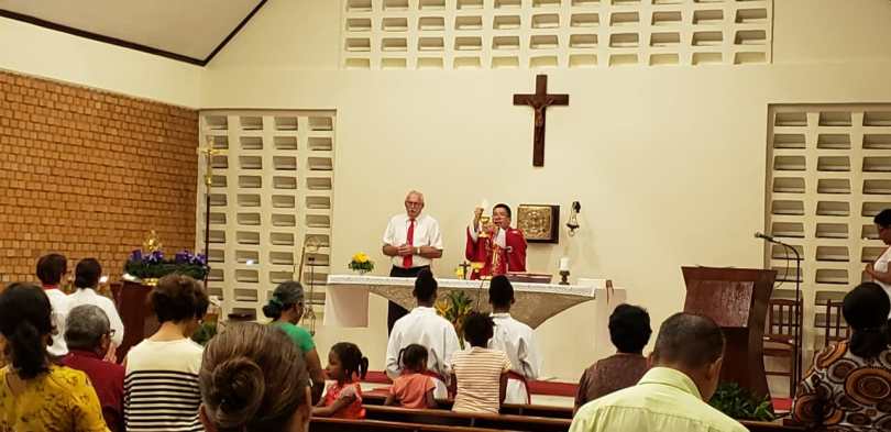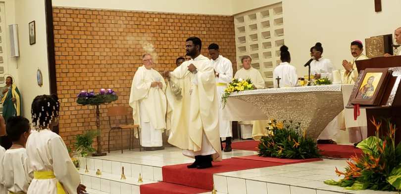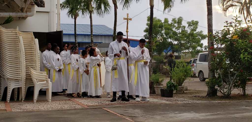 Op 18 december 1994 beleefde de gemeenschap op Geyersvlijt, Paramaribo-Noord de inzegening van een prachtige kerk aan de Kaikoesiestraat door Mgr. Aloysius Zichem in een mooie en plechtige eucharistieviering in aanwezigheid van velen die woonachtig zijn in en buiten dit woongebied ten noorden van Paramaribo. Op 18 december 2019, 25 jaar na de inzegening, was het de beurt aan Mgr. Karel Choennie om voor te gaan in een plechtige jubileum-eucharistieviering, geassisteerd door vicaris-generaal pater Esteban Kross, pastoor Kumar Irudayasamy SDS, pater Jan Geerits SDS, pater Guillaume Woei A Jin, pater Martien Noordermeer OMI, pater Iyke Ugwu en pater Patricio Dorcey CSsR. De kerk was goed bezet. Klokslag 18.00 ving de viering aan en onder het zingen van het intredelied ‘Kom ga met Mij mee’ werd in processie gelopen vanuit de sacristie via het kerkplein naar de zuidelijke kerkingang. Voorop twee misdienaars, 1 met het wierookvat, de andere met de wierookhouder, hierachter de misdienaar met het processiekruis, achter hem de andere misdienaars/misdienettes gevolgd door de lectoren, de concelebranten en de bisschop. Aansluitend op het intredelied vervolgde het Salvatorkoor – onder leiding van dirigente Sandra de Boer en met orgelbegeleiding van zuster Christine FCH – met het prachtige ‘Heer in de hemel zie ons aan’.