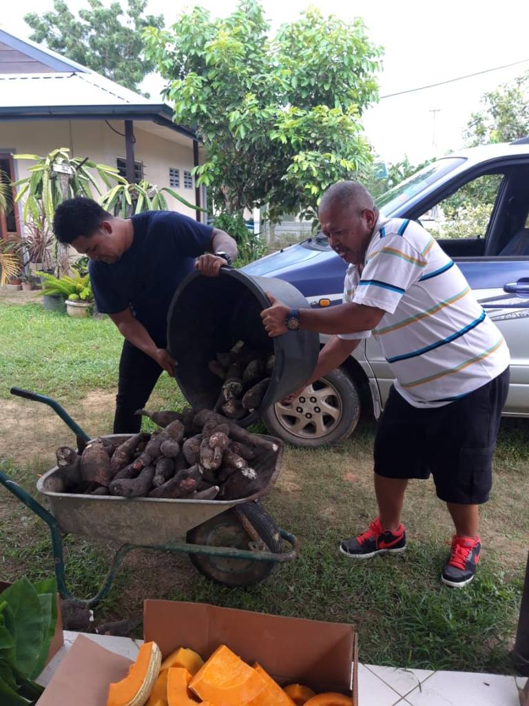 Maandagmorgen steeg het aantal gezinnnen op de lijst naar 24. Alhoewel er nog wat donaties en toezeggingen binnenkwamen, leek het maandagmorgen nog niet reëel dat wij alle gezinnen op de lijst zouden kunnen tegemoetkomen met ons Yepi-Makandrapakket. In de middag veranderde onze twijfel in blijdschap. Enkele parochianen besloten om 14 levensmiddelenpakketten te sponsoren, hierdoor hoefde de parochie maar voor 10 pakketten te betalen. Bovendien kregen wij ook nog cassave, pompoen, tayerblad en kailan van onze landbouwers in de parochie.