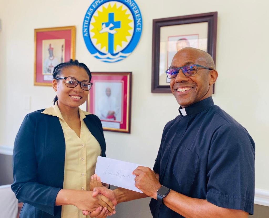 Jawanza Stuart kreeg zijn prijs overhandigd door bisschop Gabriel Malzaire, voorzitter van de AEC, in het Bishop Arnold Boghaert katholieke centrum.
