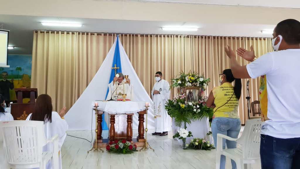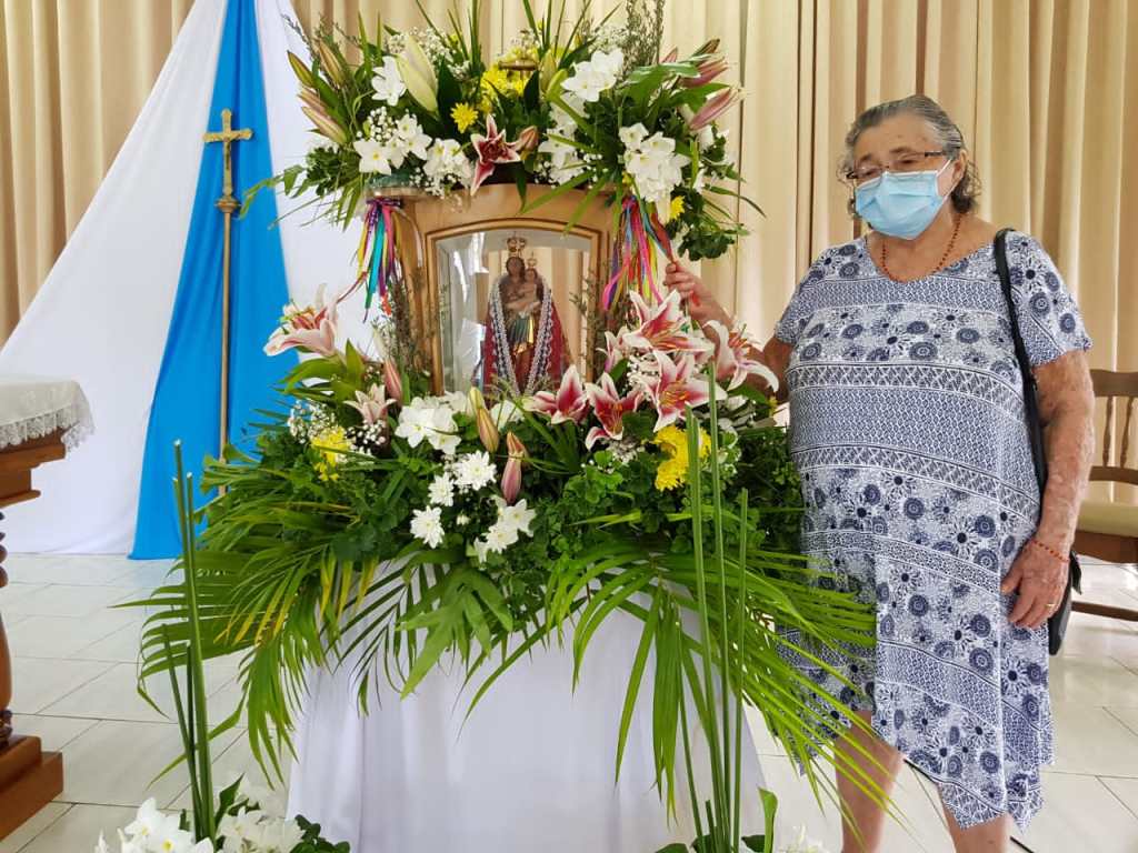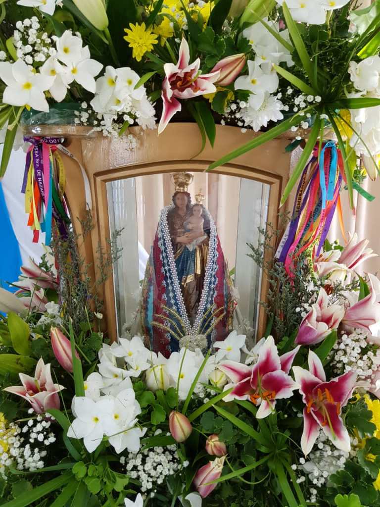 Naast het altaar staat een weelderig met bloemen versierde berlinda (glazen kast) met daarin het beeld van Moeder Maria met kindje Jezus op de arm. Bij de viering van de Heilige mis worden niet alleen liederen gezongen, maar komt ook een speciaal gebed voor Moeder Maria op het scherm. Stephanie Ferreira die elk jaar een nieuwe mantel maakt voor het beeld draagt een bekend liedje voor. De dame in Afrikaanse klederdracht, die tijdens de mis de voorzang doet, is Prisca Agon, lid van Obra de Maria uit Pernambuco, Brazilië. Agon komt oorspronkelijk uit Benin. Na de mis wordt het feest buiten voortgezet. Aan zowel hapjes, drankjes en handen om te helpen geen tekort.