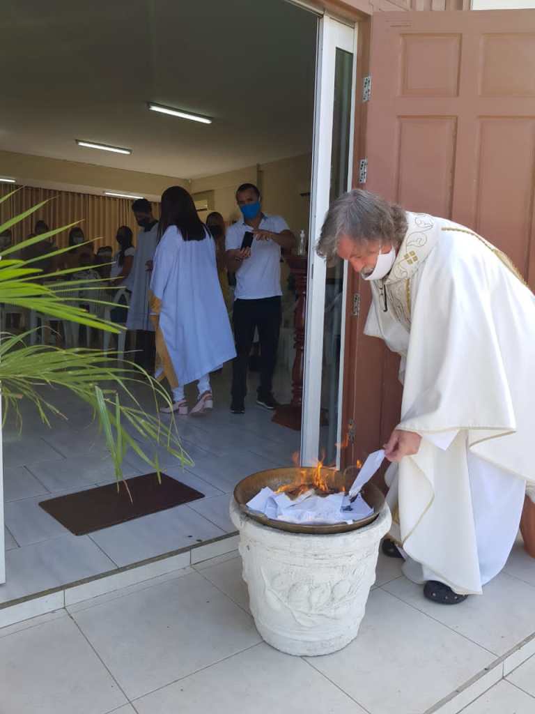 De tafels staan gedekt, een wok staat buiten. In de laatste verbrandt pater Patricio de talloze wens- en vergevingsbriefjes die in de afgelopen tijd zijn geschreven en achtergelaten in de kerk. Dan mag de heilige mis beginnen. Dit jaar geen straat processie. Ook niet in Belém waar traditioneel de Cirío de Nazaré jaarlijks op de tweede zondag van oktober wordt gevierd. De reden vanwege de pandemie is bekend. Om mensen de kans te geven beide vieringen mee te maken, heeft de Braziliaanse parochie in Suriname vorig jaar besloten om de viering voortaan op de laatste zondag van oktober te houden. Echter, niet iedereen in de Braziliaanse gemeenschap kan hiervoor begrip opbrengen, hoewel in hun land het zelf een normaal verschijnsel is dat deze ‘Tweede Kerst’ van het jaar op een andere dag wordt gevierd. Bijvoorbeeld in Marajó, een groot eiland op een uur varen van Belém, wordt de Cirio in november gevierd.