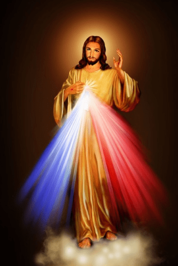 De heilige Faustina was een Poolse non van de congregatie van de zusters van Onze Lieve Vrouw van Barmhartigheid. Jezus verscheen aan haar in een wit gewaad. Zijn rechterhand was in een teken van zegen opgeheven en de andere wees op Zijn borst ter hoogte van Zijn hart. Uit het kleed, dichtbij het hart, schitterden twee stralenbundels: de ene rood en de andere wit.
