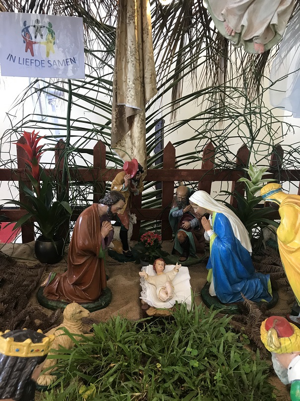 Deze begrijpelijke beperkingen van onze vrijheden hebben onze medewerkers en medewerksters van de technische en de versiergroep geenszins weerhouden toch een aangename sfeer in onze kerk te creëren. Voor de misvieringen in de adventsperiode hadden wij een sobere aankleding – de adventskrans met drie paarse kaarsen, een roze kaars en paarse linten. Voor de kerstperiode werd de kerk prachtig versierd en werd ook een heel mooie kerststal gebouwd in het teken van “in liefde samen”, het thema van het beleidsplan 2020-2024 van het bisdom. In deze prachtige omgeving werden de plechtige eucharistievieringen opgedragen. Via de Facebookpagina van de parochie werden de diensten live uitgezonden. Gelovigen thuis hebben in hun eigen omgeving deze kerstdiensten gevolgd; zij hebben ook kunnen genieten van de mooie versieringen en van de kerststal. Bereids hebben ook velen van de geboden gelegenheid gebruikgemaakt om op bepaalde tijdstippen de kerstversiering en de kerststal te bewonderen en te bidden, een en ander met in achtneming van de geldende COVID-19-instructies en onder begeleiding van onze parochiemedewerkers.