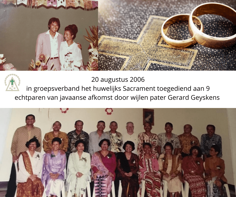 Een bijzonder moment en een unieke gebeurtenis in ons huwelijksleven was toen pater Gerard op 20 augustus 2006 aan negen Javaanse echtparen het huwelijkssacrament toediende. Wij behoorden tot deze groep. Zoals in elk huwelijksleven hebben ook wij ups en downs meegemaakt. Maar door geloof en volharding, en de genade van Onze Lieve Heer hebben we dit kunnen trotseren. We zijn nu nog steeds samen in liefde en verbondenheid, en gaan verder met Hem als onze Leidsman.
