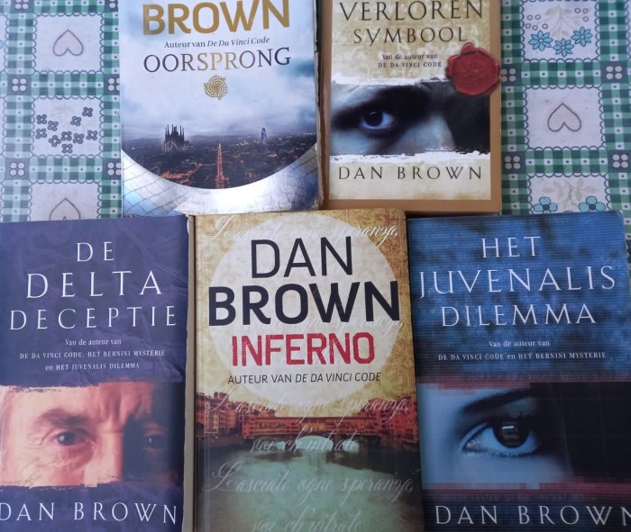 Ik kreeg nu met zoveel vrije tijd ineens het verlangen om het boek in het Nederlands weer eens te lezen. Ik had nl. alle 5 uitgekomen boeken van Dan Brown kunnen bemachtigen in een kringloopwinkel samen voor de prijs van 10 €. Het zijn: De Da Vinci Code, Het Juvenalis Dilemma, Het Bernini Mysterie, Het Inferno en Het Verloren Symbool. Wie aarzelt dan zo’n literaire rijkdom aan te schaffen voor zo’n prijs? De oorspronkelijke prijs was €19,95 per stuk.