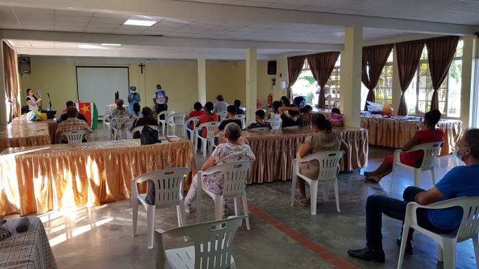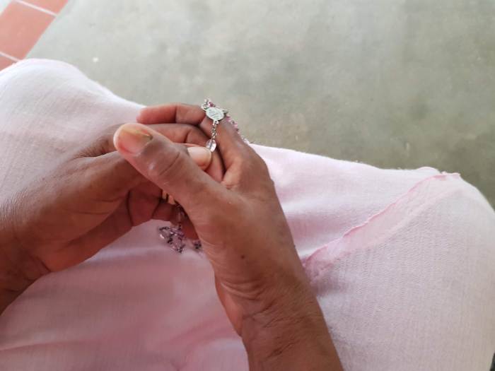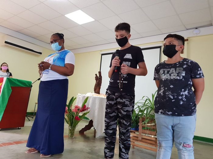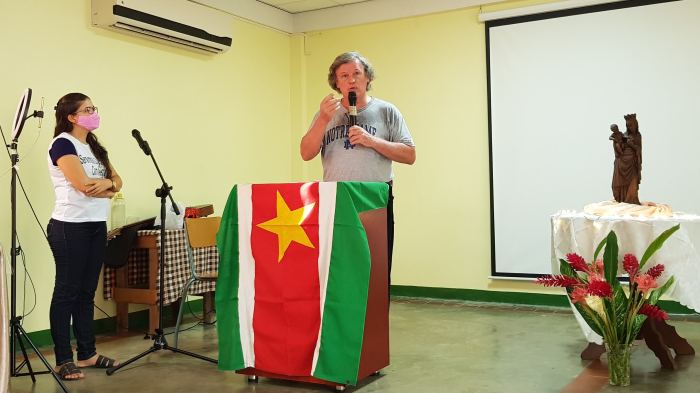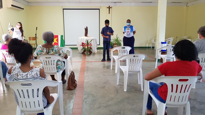 Zij openen het cenakel met de geloofsbelijdenis, daarna volgt het bidden van de rozenkrans. Gerda Alvares-Misidjang, hoofd van het Pastoraal Centrum, geeft een korte uitleg over de werkwijze van Obra de Maria. “Hun methode is de mensen thuis bezoeken voor het evangelie, rozenkrans bidden en delen van het Woord. In de kerk komt er misschien maar één lid van het gezin, maar thuis bereik je de hele familie. In Brazilië heeft het gewerkt en nu willen ze dit ook in Suriname introduceren. Eén of twee keer per jaar willen ze dan met een groot cenakel alle families bij elkaar brengen om de rozenkrans te bidden. Daarvoor zijn we hier vandaag.”