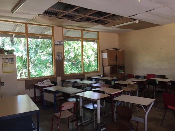 Maar ook de van de brand bespaarde vleugel ziet er niet goed uit. De ruimte van het kantoor annex magazijn moet goed aangepakt worden. Ook hier hangt het plafond. De klassen vertonen min of meer hetzelfde troosteloze beeld: oud meubilair, hangende plafondplaten, kapotte tussenschotten en muren. De leerkrachten die in een van de lokalen in de banken zitten, kijken ons hoopvol aan. Er is aandacht nodig voor de Heilig Hartschool. Zo kunnen ze niet werken. Het is maar te hopen dat niemand gewond raakt wanneer zo’n plafondplaat losraakt. We gaan buiten onder een amandelboom zitten wachten op het Rooms Katholiek Bijzonder Onderwijs (RKBO) dat ook aanwezig zal zijn voor het bespreken van de situatie.