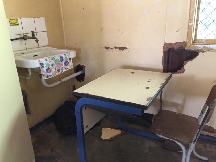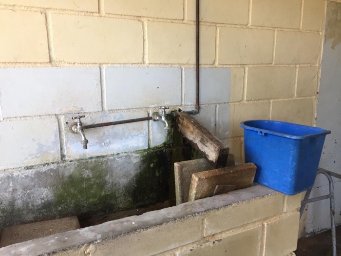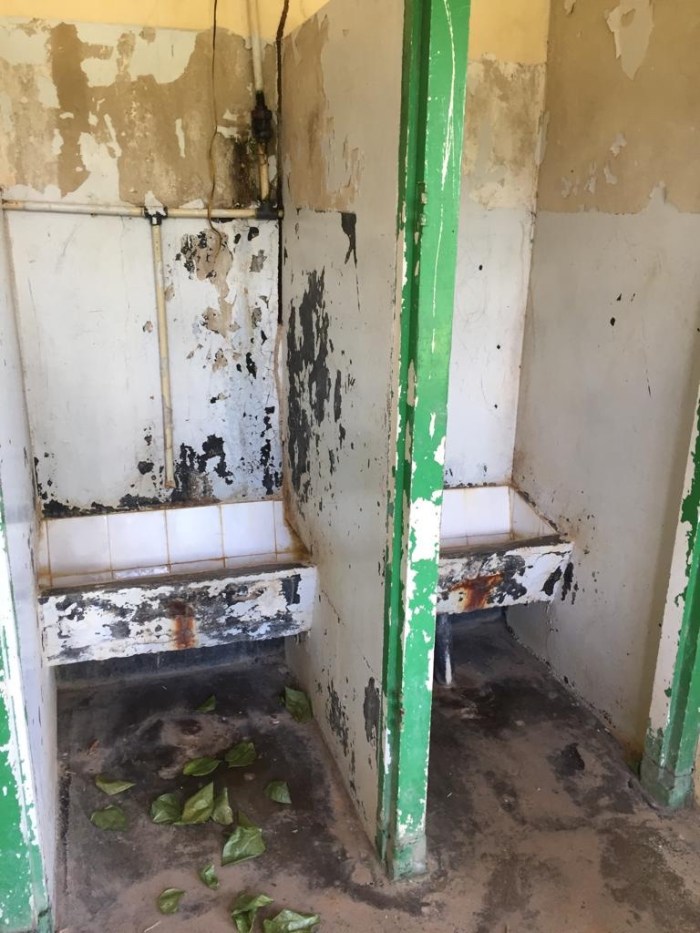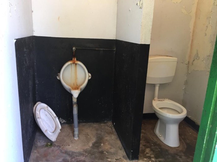 De schoolleider en het onderhoofd leiden ons rond bij de toiletten. Het is gruwelijk om te zien. Loshangend plafond, niet schoon te maken wasbak en kraantjes, meerdere kapotte deuren en de toiletpotten… Er is wel een scheiding tussen de wc voor de jongens en de meisjes. Onder dit dak is trouwens de helft voor de Heilig Hartschool. De andere helft wordt gebruikt door de leerlingen van de Giovanni Montinischool. Maar ook die helft ziet er niet fris uit. “En uit deze kranen moeten de kinderen water drinken wanneer ze dorst hebben,” zegt het onderhoofd. Ik hoor iets ritselen tussen de muren. Wie weet is er een heel muizennest daartussen.