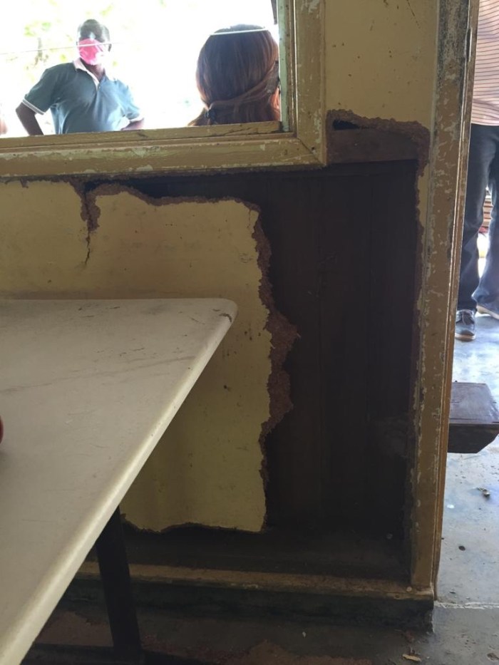 Wanneer de delegatie van het RKBO arriveert is het net voor 13:00 uur. De school zou dan al uit zijn en de bijna 200 kinderen die op de school zouden moeten zijn, zouden onderweg zijn naar huis. De 10 leerkrachten moeten de schoolbus in en gaan onverrichterzake naar huis. De jongemannen hebben intussen al het gemaaide gras bijeengeharkt en opgestapeld. “Niet aansteken, hoor, we willen niet nog een ramp,” grapt iemand. De technische man van het RKBO was de week ervoor al geweest met een aannemer om het werk op te meten. Ook het nieuwe schoolhoofd heeft een aannemer gevraagd om een begroting van de renovatie van ten minste de toilettengroep te maken. Het is duidelijk dat er iets gedaan moet worden. “Het projectvoorstel is inderdaad af en ingediend. Ook de vicepresident van Suriname moet het dossier gehad hebben,” zegt de directeur van het RKBO. “Er is geen enkele reactie binnengekomen.”