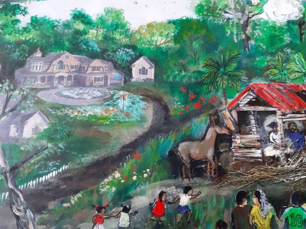 De artiest beeldt de rijken af door dure kolossale, niet-Surinaamse huizen. Die huizen heeft hij niet zelf geschilderd maar geknipt uit een buitenlandse magazine en in het schilderij geplakt. Ik denk als aanklacht tegen de zucht van rijken in Suriname en allen die rijkdom najagen om alles wat van buiten is na te apen en mooier en beter te vinden dan wat we in Suriname zelf maken. Deze huizen zijn uiteraard gelegen aan een goed verharde weg. De wegen worden bijna overal ter wereld door de overheid verhard met belastinggeld of dure leningen. In deze rijke buurt is het gras keurig gemaaid, zijn er bloemperken en een fontein. Wat bijzonder opvalt is dat je in deze rijke buurt geen kinderen buiten ziet spelen of mensen die met elkaar in gesprek zijn. In mijn fantasie zie ik ze dan elk in hun eigen kamer met een eigen televisie of gekluisterd aan hun smartphone. In de gesloten garages zie ik twee dure auto’s. Daar viert het individualisme hoogtij, daar is egoïsme en hebzucht een levensfilosofie. Als dat onze ambitie is, als we buitenlands fruit lekkerder blijven vinden dan Surinaamse, dan zullen we nooit genoeg deviezen verdienen en zal de koers op hol geslagen blijven.