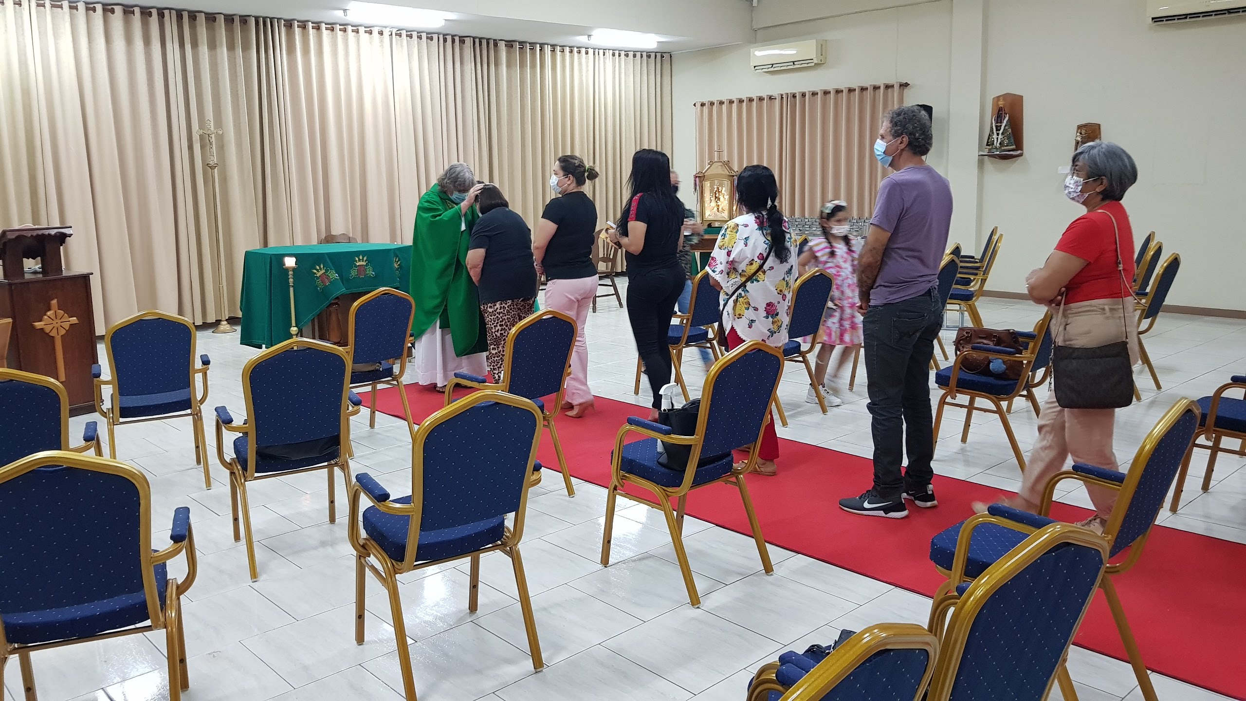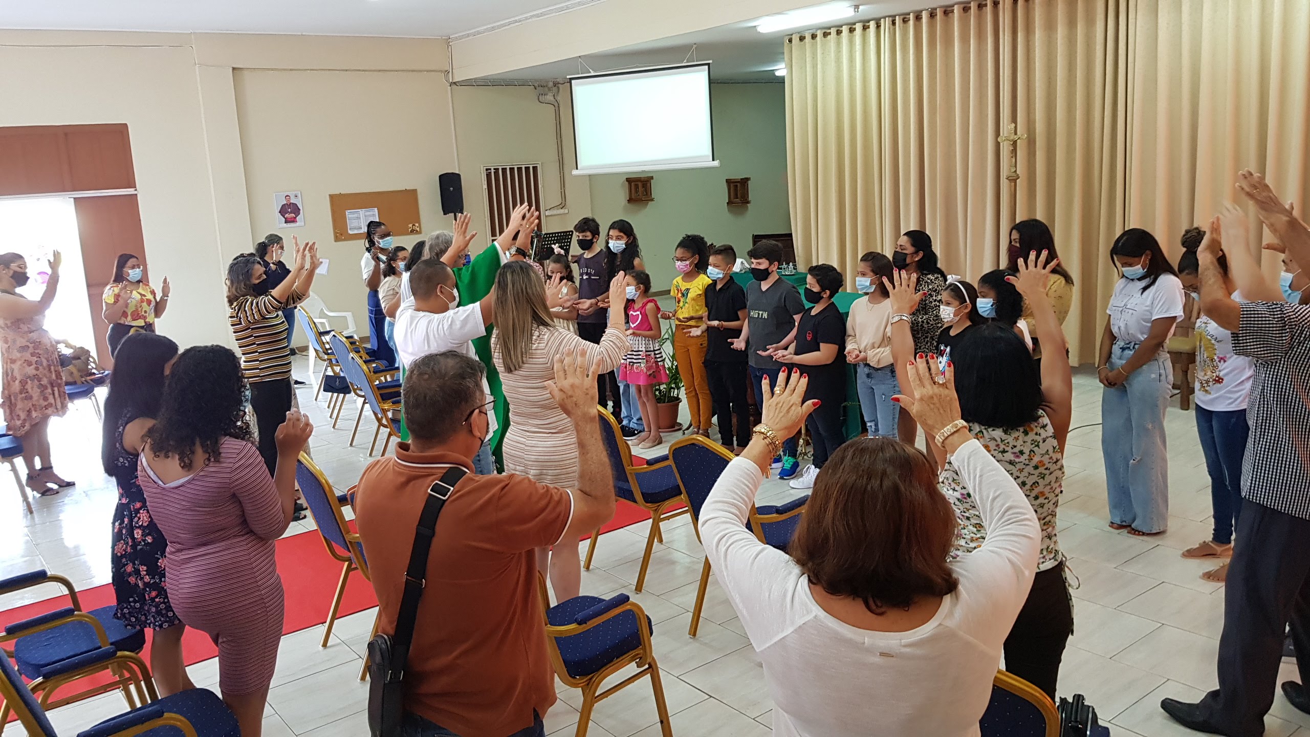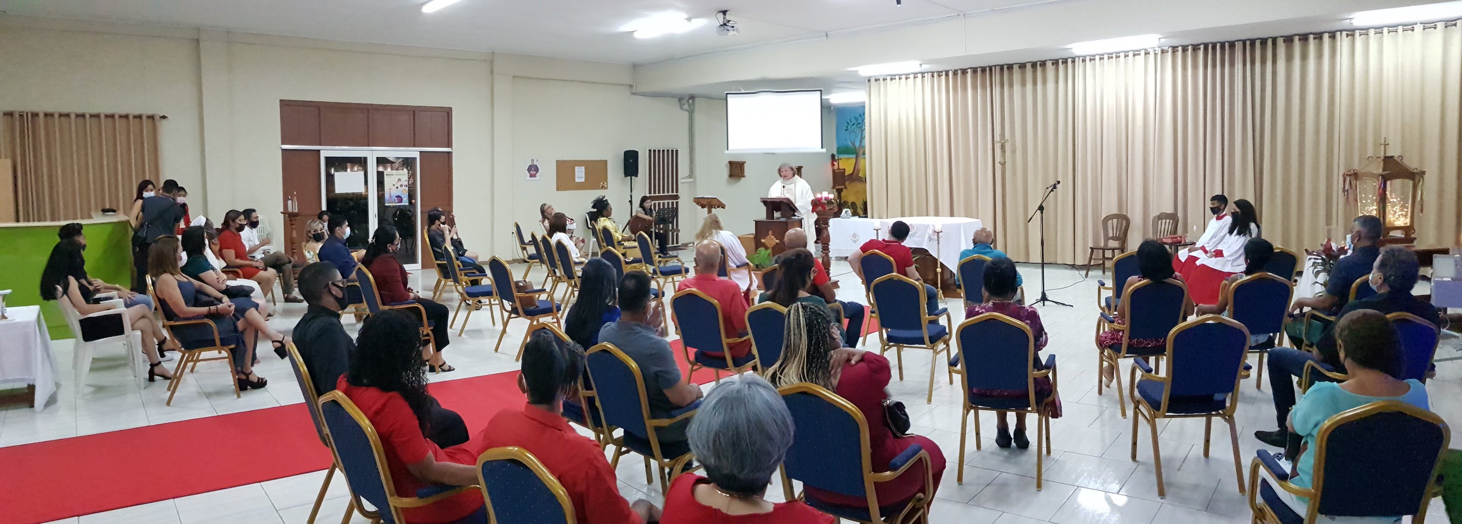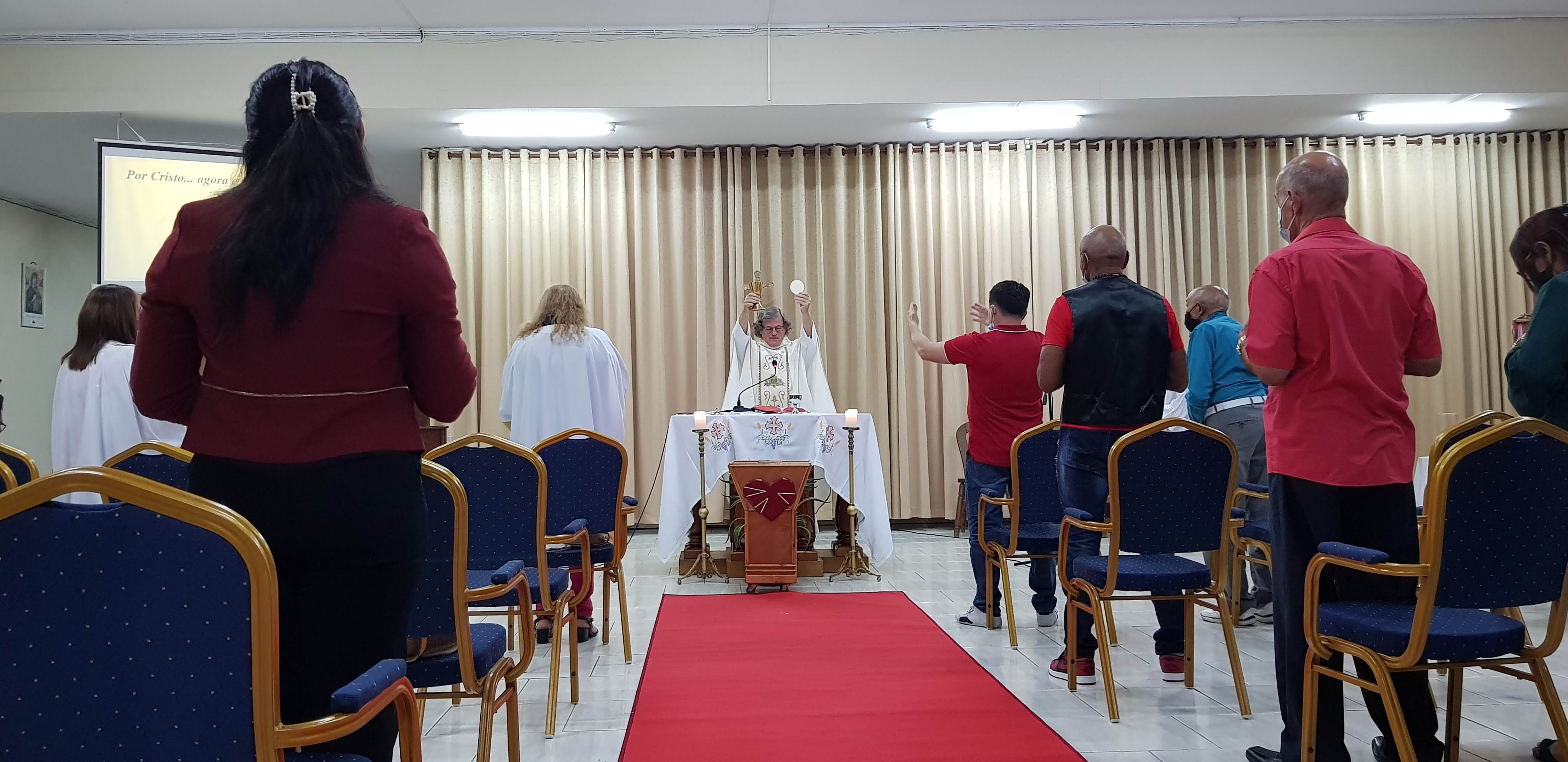 Het unieke aan Nossa Senhora heeft ook te maken met enkele weglatingen die normaal voorkomen in een katholieke kerk. Het altaar, dat staat op een fraai houten draaiwerk, is in octagonale vorm en is waarschijnlijk de kleinste diensttafel die je tegenkomt. Boven het altaar ontbreekt een groot kruis met Christus, maar pater Patricio wil er dit jaar nog werk van maken om er eentje te hangen. Alleen staat het plafond niet erg hoog. De reden van de geringe hoogte en het ontbreken van de veertien staties aan de muren heeft namelijk te maken met het gebouw. De ruimte waarin de diensten worden gehouden, was namelijk bestemd als parochiezaal. Het echte kerkgebouw moet nog verrijzen op het terrein, tesamen met andere zaken zoals een gymzaal en een sport- en speelveld voor kinderen van de St.-Petrus Dondersschool. Vandaar de grote open plek op het terrein. Maar zoals het ernaar uitziet (met de matige opkomst) zal de situatie voorlopig zo blijven. De zondagmis in de Nossa Senhora de Nazaré vangt aan om 9:00 uur. De andere vieringen zijn op de dinsdag en donderdag om 19:00 uur, respectievelijk Marialof (Onze Lieve Vrouw van Altijddurende Bijstand) en aanbidding van het Heilig Sacrament. Alle diensten worden geheel in de Portugese taal verricht, maar u bent er ook van harte welkom.
