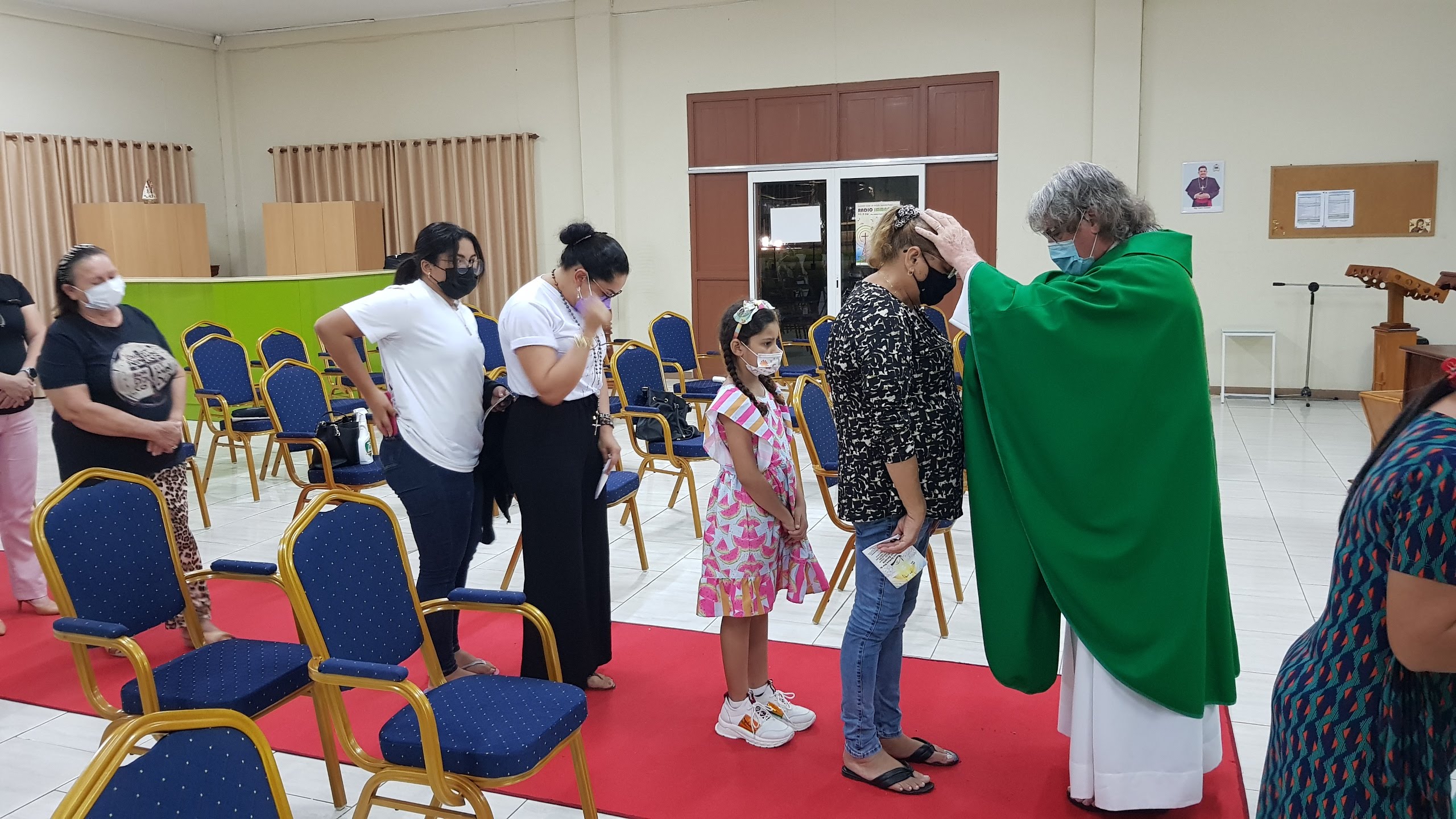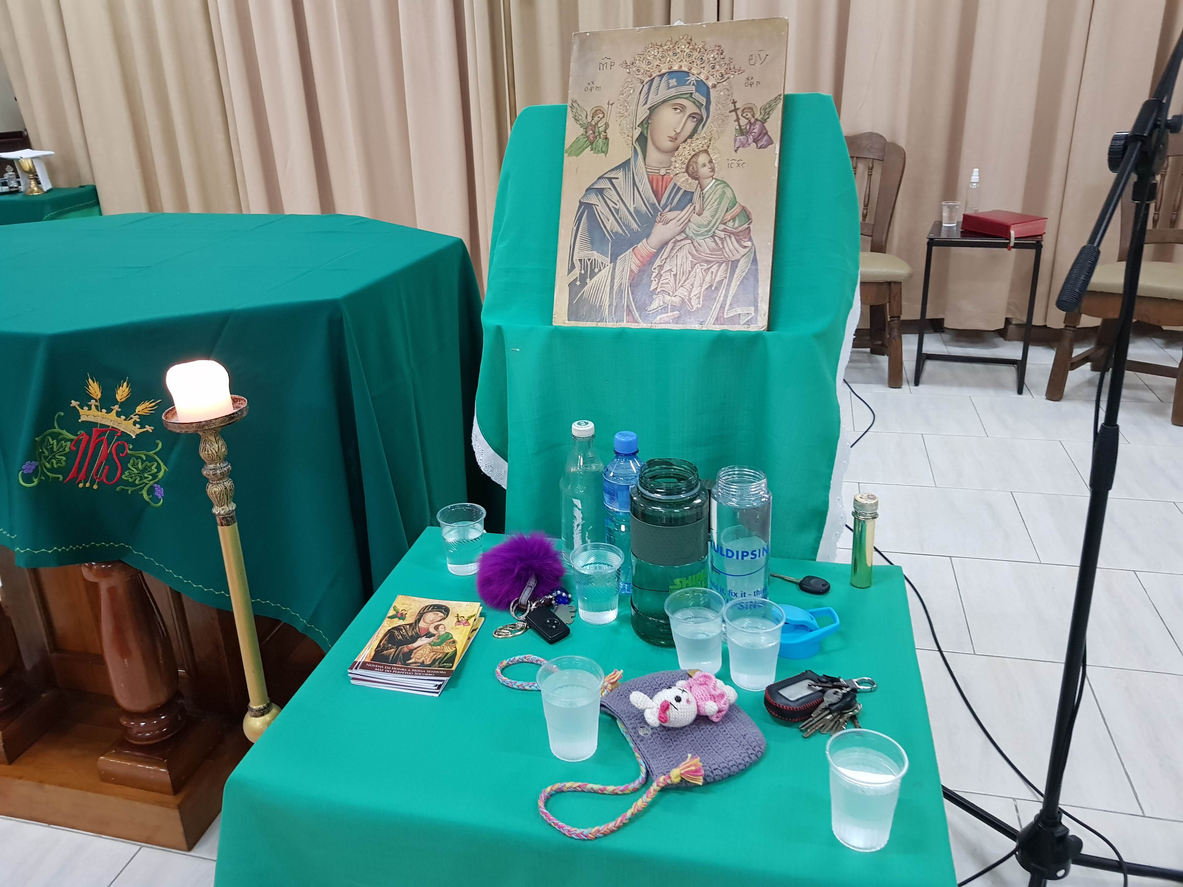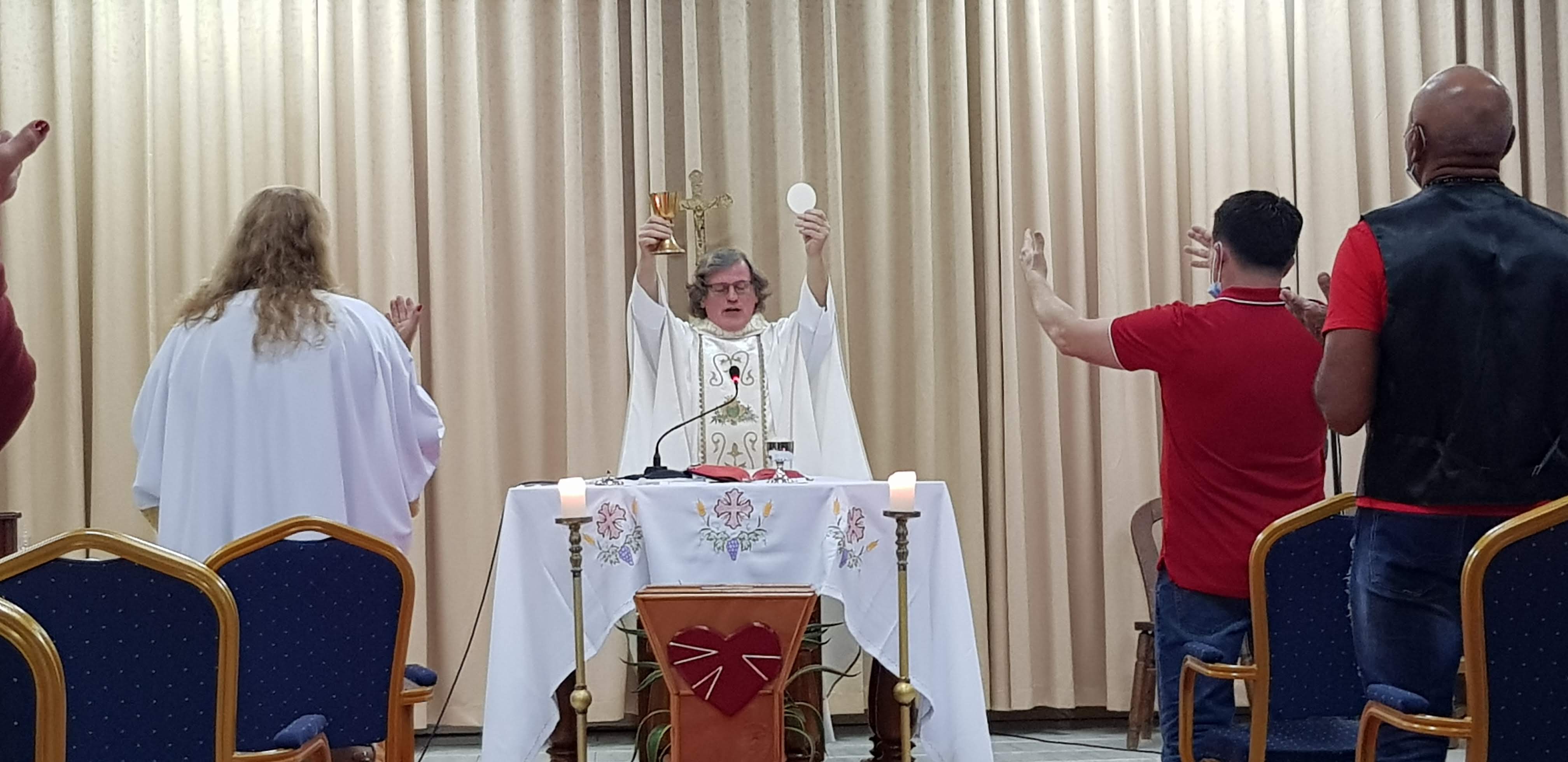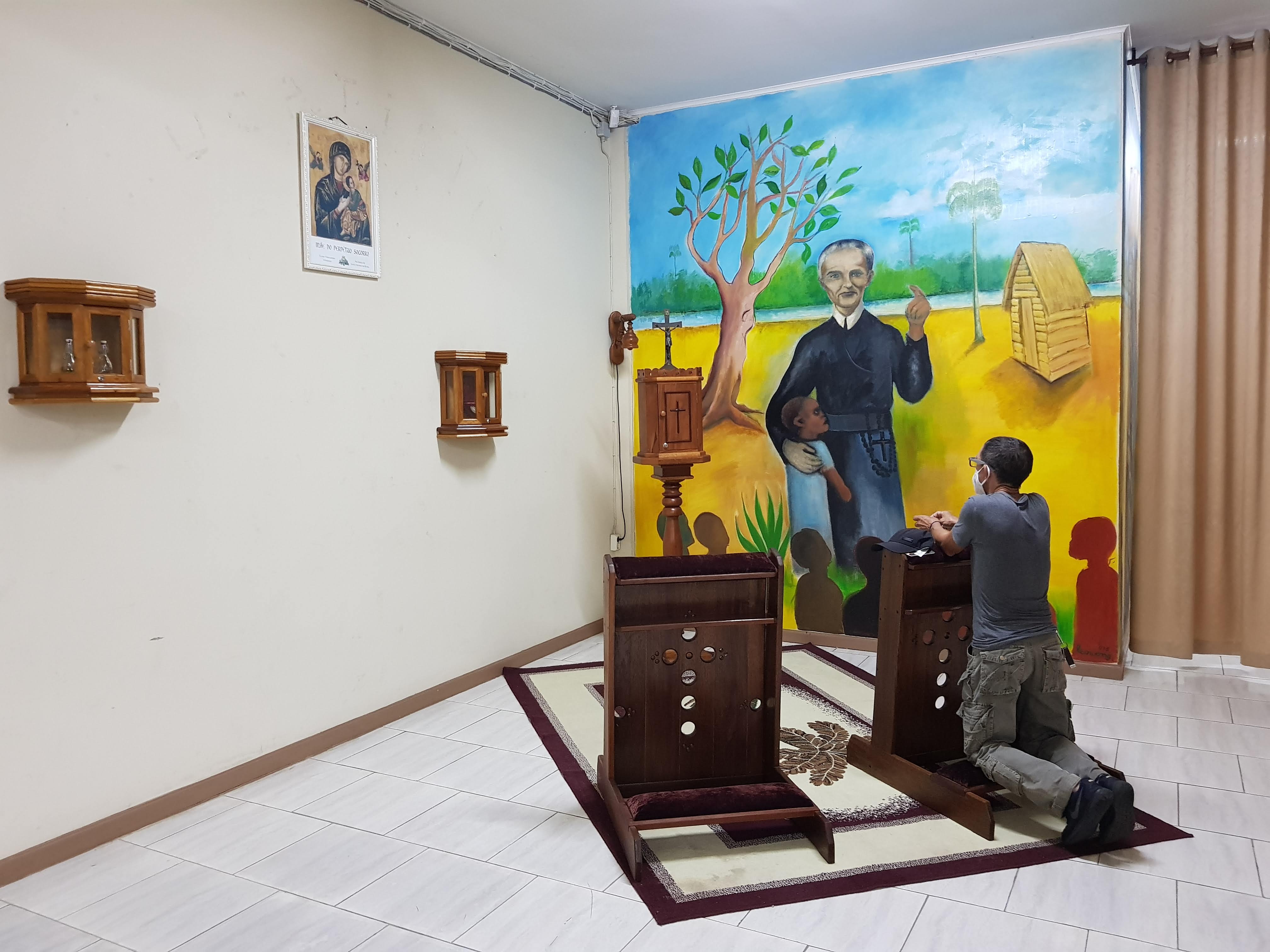 Het unieke aan Nossa Senhora heeft ook te maken met enkele weglatingen die normaal voorkomen in een katholieke kerk. Het altaar, dat staat op een fraai houten draaiwerk, is in octagonale vorm en is waarschijnlijk de kleinste diensttafel die je tegenkomt. Boven het altaar ontbreekt een groot kruis met Christus, maar pater Patricio wil er dit jaar nog werk van maken om er eentje te hangen. Alleen staat het plafond niet erg hoog. De reden van de geringe hoogte en het ontbreken van de veertien staties aan de muren heeft namelijk te maken met het gebouw. De ruimte waarin de diensten worden gehouden, was namelijk bestemd als parochiezaal. Het echte kerkgebouw moet nog verrijzen op het terrein, tesamen met andere zaken zoals een gymzaal en een sport- en speelveld voor kinderen van de St.-Petrus Dondersschool. Vandaar de grote open plek op het terrein. Maar zoals het ernaar uitziet (met de matige opkomst) zal de situatie voorlopig zo blijven. De zondagmis in de Nossa Senhora de Nazaré vangt aan om 9:00 uur. De andere vieringen zijn op de dinsdag en donderdag om 19:00 uur, respectievelijk Marialof (Onze Lieve Vrouw van Altijddurende Bijstand) en aanbidding van het Heilig Sacrament. Alle diensten worden geheel in de Portugese taal verricht, maar u bent er ook van harte welkom.