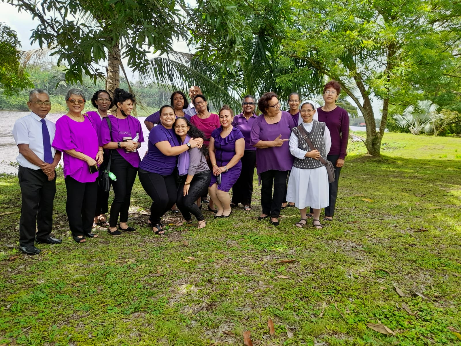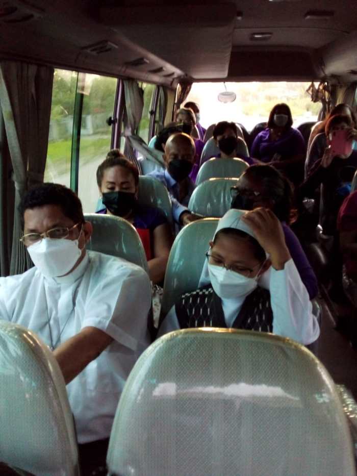 Het Salvatorkoor was op pad. Compleet met mondkap, zangmapje en Jubilate zat iedereen in de bus. Vol goede moed en enthousiasme. Samen op weg met monseigneur Karel Choennie en de zusters Franciscanessen van Charitas, Flora en Christien naar onze zusterparochie St.-Thaddeus in Groningen in het district Saramacca. Natuurlijk was er onderweg ook tijd voor ons teamsong ‘Heer wat een voorrecht om in liefde te gaan’ dat uit volle borst werd gezongen.