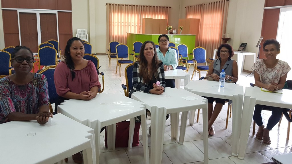 Op een gegeven moment vraagt Charles dat de deelnemers de omgeving in zich opnemen. De workshop is niet voor niets hier. Nossa Senhora de Nazaré lijkt niet op een kerk, toch zijn er zaken die typerend zijn voor het huis van God. In het midden van de zaal is er een altaar met aan elke zijde een kaars. Er is een rode loper neergelegd van de voordeur tot aan de tafel van de Heer. Uiterst links, een beetje in een hoekje, is een prachtige muurschildering van de zalige Petrus Donders, die een kind omhelst. Aan de knielbankjes kun je zien dat er hier een bidhoekje is. Ook de tabernakel met het Allerheiligste bevindt zich aan deze kant van het gebouw.
