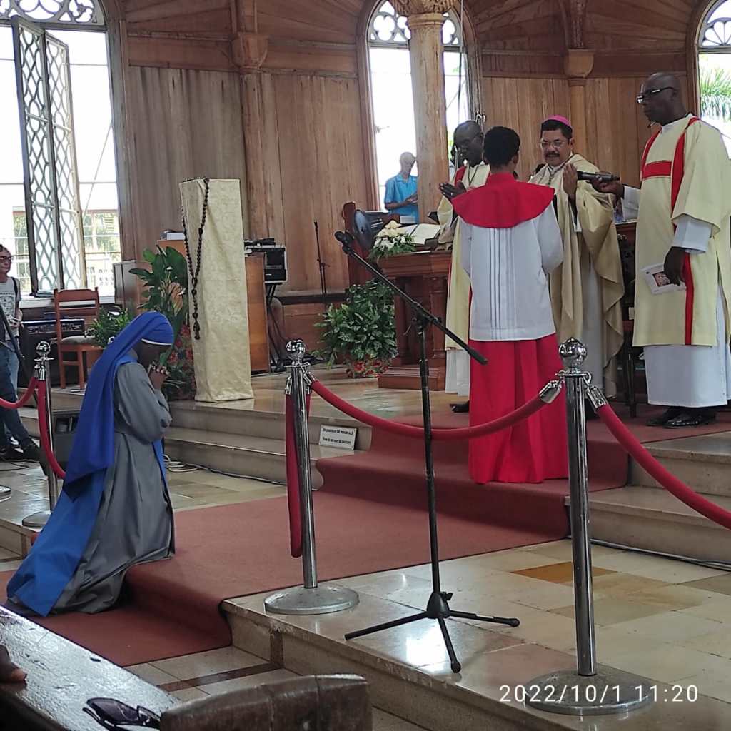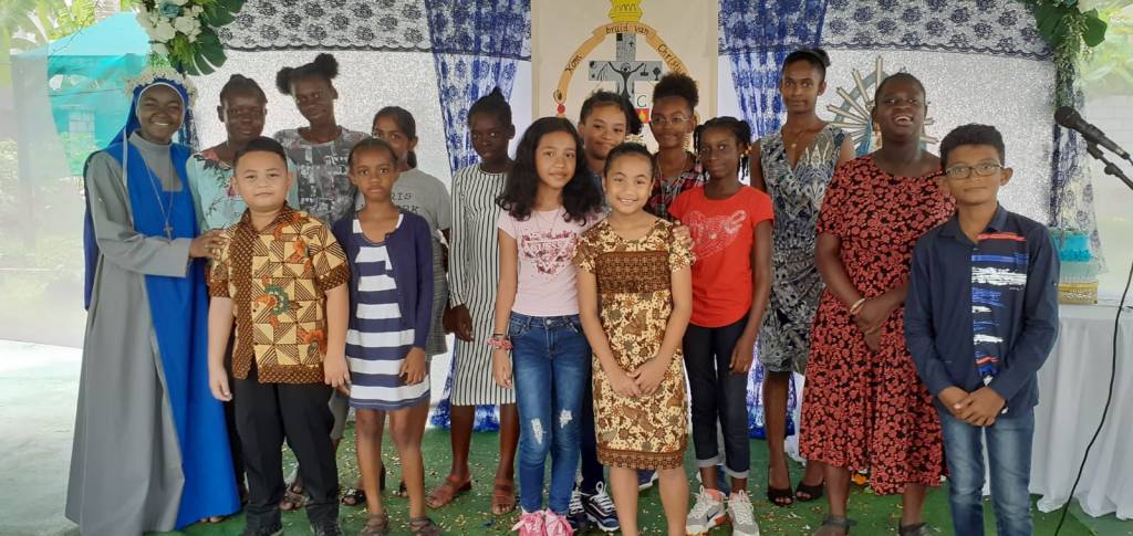 ‘Een woord of een glimlach is vaak genoeg om een moedeloze ziel nieuw leven in te blazen.’ Dit is een bekende citaat van St.-Theresia van Lisieux. Op de feestdag van deze heilige, 1 oktober jl., heeft zuster Maria van de Passie van Christus Galimon SSVM haar eeuwige geloften afgelegd in de kathedrale basiliek. Twee weken voor deze grote dag was zuster Passie voor enkele dagen op familiebezoek in het district Para. In die periode bezocht zij de diensten van de parochies in de omgeving waaronder Sint-Jozef Copieweg. Haar bezoek wakkerde enthousiasme aan bij verschillende parochianen om de dienst van haar eeuwige professie bij te wonen. Pater Fransiskus besloot daarom om een algemene oproep te doen in de kerk. Na overleg met de koorleidsters en de ouders werd ook besloten dat het koor God’s Singing Angels mee zou gaan.